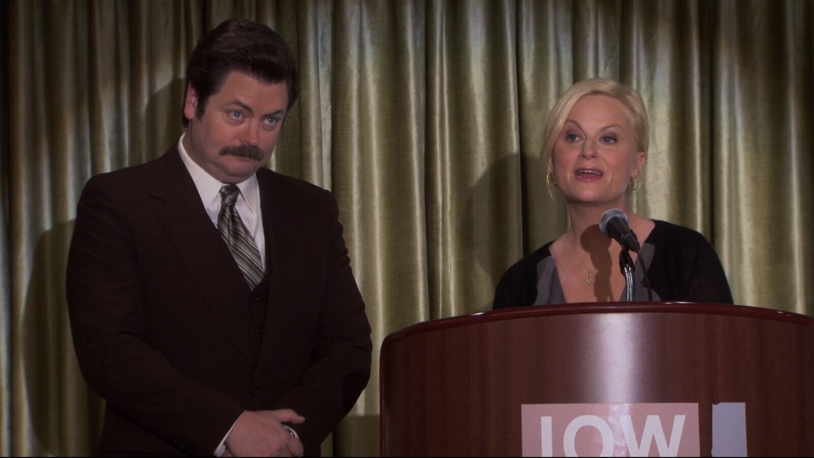 The show continues to repeatedly lambaste the very concept of awards, revealing that the organization purposefully selected a man to boost attendance. At one point, Ron tells Leslie that “awards are political, and everybody has an agenda. You spend your life chasing them, you’ll drive yourself nuts.” Umm, are we still talking about the Indiana Organization of Women’s Dorothy Everton Smythe Woman of the Year award?
