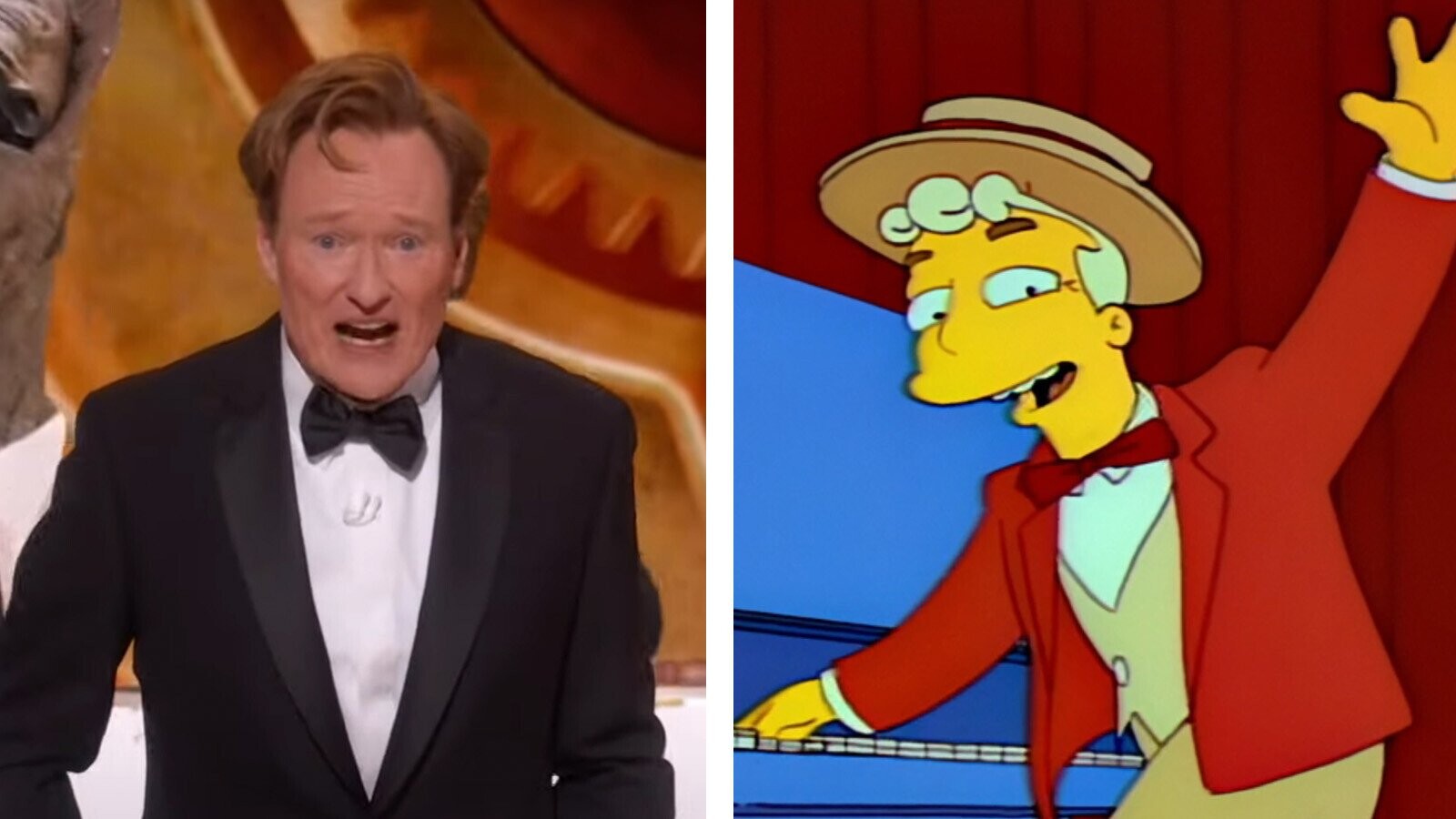 While he didn’t don a straw hat and a red jacket, Conan similarly brought out an old-timey cane for his Oscars performance. And, as a lot of Simpsons fans pointed out on social media, the random musical interjection certainly felt of a piece with the Monorail routine from 32 years ago.