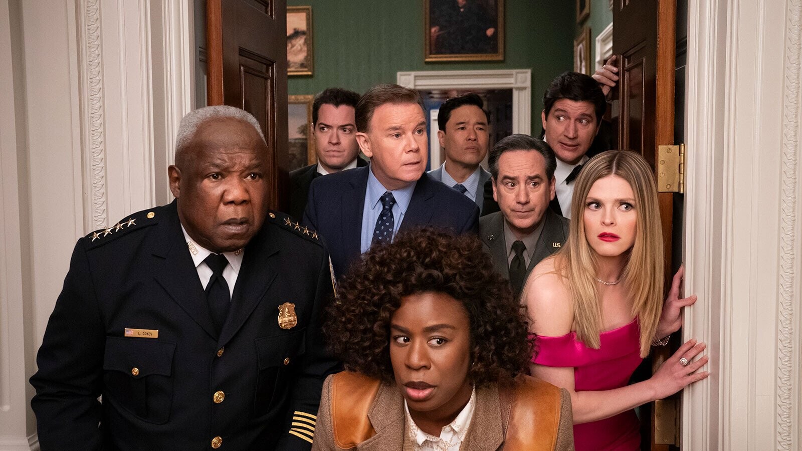 In The Residence, A.B. Wynter (Giancarlo Esposito) is the White House Chief Usher — or, rather, he was, because in the cold open of The Residence’s series premiere, he is found dead. As soon as his body is discovered, officials like FBI Director Wally Glick (Spencer Garrett) and Irv Samuelson (Andrew Friedman), the head of the National Park Police, jockey for jurisdiction; however, investigating the crime, if it is one, falls to D.C.’s Metropolitan Police Department. Thus, Chief Larry Dokes (Isiah Whitlock Jr.) calls in “the best detective in the world”: consulting detective Cordelia Cupp (Uzo Aduba). A.B.’s death would have been touchy under any circumstances, but because it has occurred during a state dinner for Australia hosted by President Perry Morgan (Paul Fitzgerald) and his husband Elliott (Barrett Foa), Cupp’s attempts to lock down the building and interview every person in it are even more complicated and unpopular.