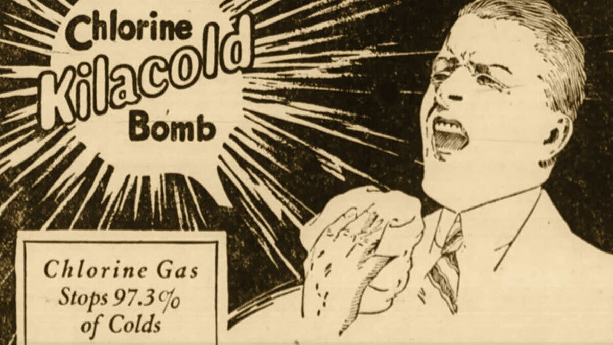 Today, we still don’t know why those workers fared so well. Maybe it was because they had jobs, so they were hardier than the average person in town. But the theory at the time credited incidental exposure to chlorine. This resulted in a few dubious experiments to confirm that chlorine really can be good for the lungs, followed by the release of the product above, the Chlorine Kilacold Bomb. It was an ampoule of chlorine that you could inhale to purportedly relieve and even cure respiratory illnesses, including the common cold.