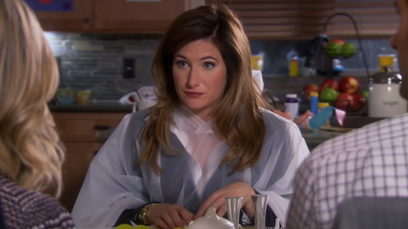 In one episode, Jen shows up to their house wearing a waterproof poncho. When asked about the unusual get-up, the happily childless Jen claims that every surface in their house “is sticky.” Her fears are vindicated at the end of the scene when one of Ben and Leslie’s triplets bolts past the table and gets paint on their guest, at which point Jen stands up and shouts: “PONCHO!”