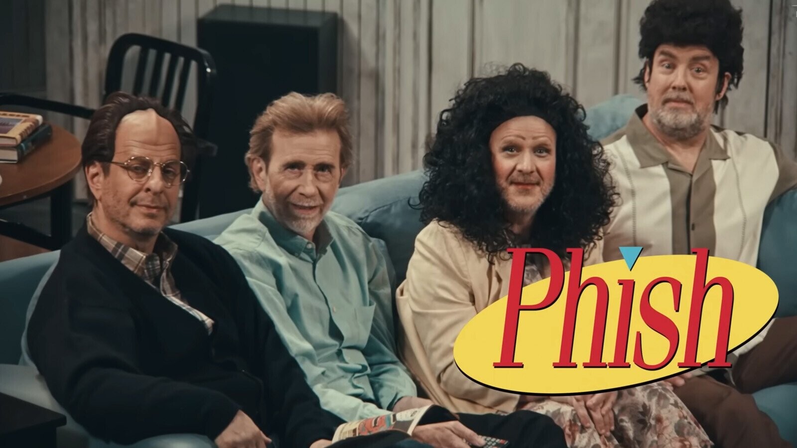 This week’s Body Double-inspired telescope bit revealed an oddly dilapidated replica of the Seinfeld apartment, which, to everyone’s surprise, was occupied by members of the band Phish, all wearing costumes and janky makeup that made them resemble the disfigured corpses of the sitcom’s four lead characters. Although, as Mulaney randomly pointed out, guitarist Trey Anastasio was not wearing a wig. “Phish is acting like Seinfeld, that’s fascinating!” sidekick Richard Kind exclaimed.