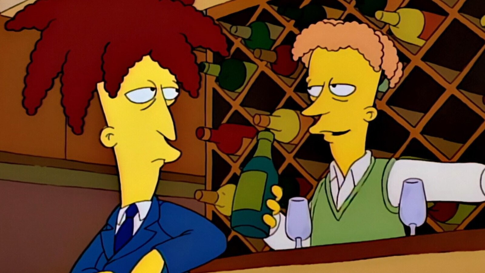 The similarity between the two characters was really cemented in Season Eight’s “Brother From Another Series,” which guest starred David Hyde Pierce. Pierce, who, of course, played Dr. Niles Crane, voiced Sideshow Bob’s jealous brother Cecil. In addition to the meta casting choice, a number of other Frasier nods were shoehorned into the episode, including Cecil’s swank wine-filled bachelor pad and the sitcom’s trademark title cards.