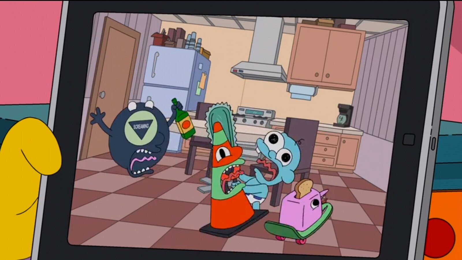 Bart, on the other hand, is watching a new animated series called Screaming Friends, which is full of gratingly loud oddball cartoon characters. “The jokes are great, but what I love is the storytelling,” Bart tells Marge.