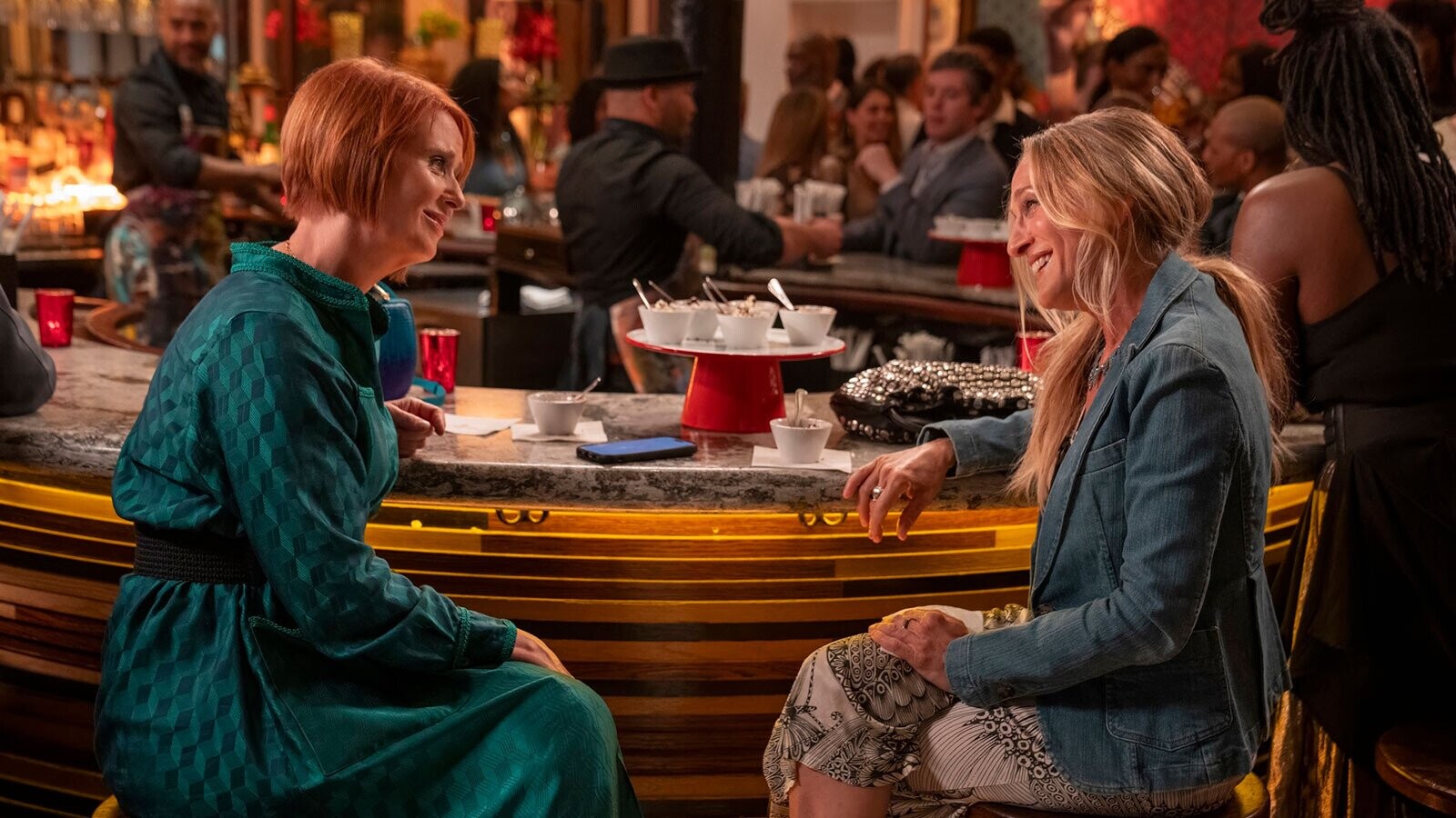 In the season premiere, the Carrie/Aidan situation isn’t getting great reviews. When Carrie happily burbles about such tokens of love as a blank postcard from Aidan in Virginia, her best friends Charlotte (Kristin Davis) and Miranda (Cynthia Nixon) pointedly suck on their cocktail straws in order not to have to affirm Carrie’s excitement. When Seema (Sarita Choudhury) complains about the strain of her long-distance relationship with Ravi (Armin Amiri) while he directs a Marvel movie in Egypt, her amazement that Carrie needs so little affirmation from her partner feels like an insult wrapped in a compliment. Anthony (Mario Cantone) is the most direct, aggressively asking why Carrie doesn’t know when she’s going to see Aidan next and what exactly she means when she says they’ll “figure it all out,” but later walking it back with apologies after his boyfriend Giuseppe (Sebastiano Pigazzi) suggests that Anthony could stand to be a little less himself sometimes.