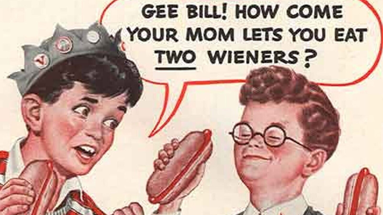 The reason mom lets Bill there eat two wieners is she thinks these are more economical than competing sausages, because she’s paying just for the meat instead of all that discarded skin. Plus, with food safety still in its infancy, you never knew how clean intestines were. So, buy Skinlessᵀᴹ wieners. Always straight — never curved (giggle).