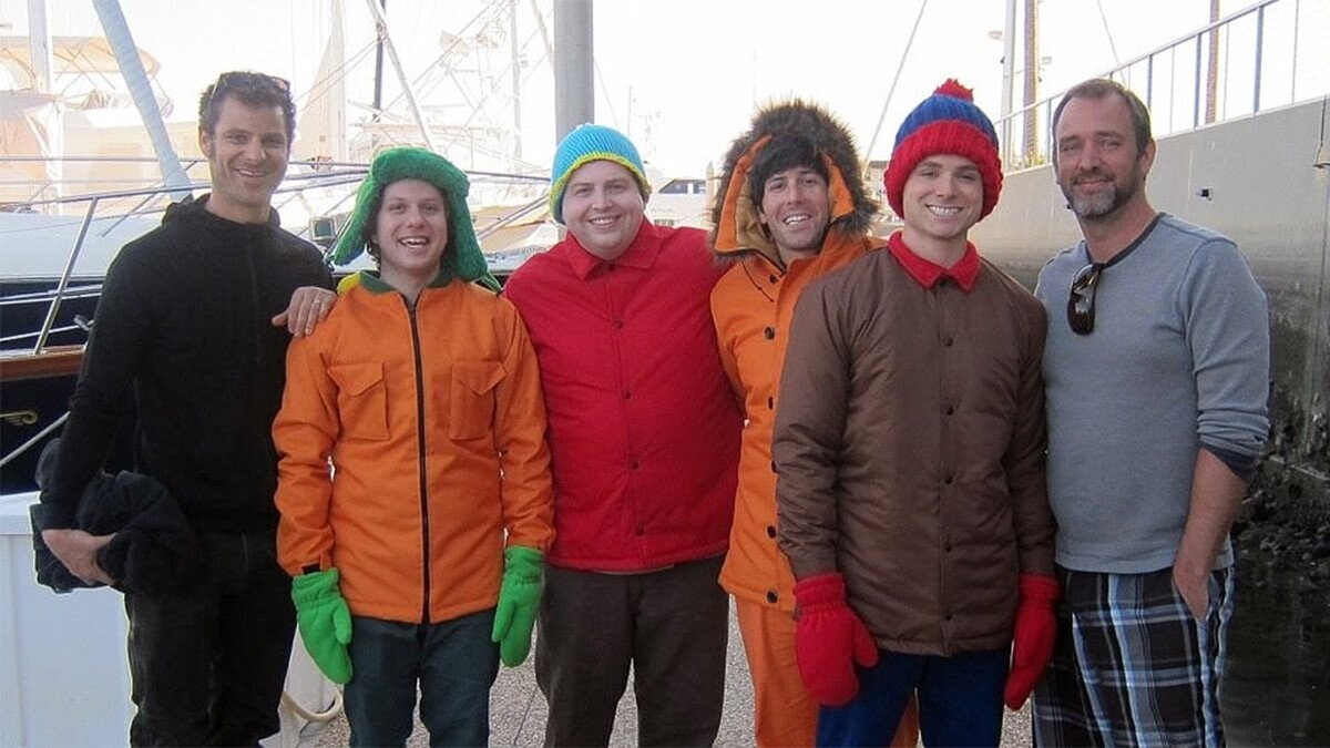 No, there was no rehearsal. I went in one day for a costume fitting, and that was an event for me too. I went into a bathroom and they gave me the full-on Cartman costume. All of us originally had the full winter gear — the hat and the coat and the gloves. They actually don’t have the full costume in the episode, though. I have a picture of all of us wearing them with Matt and Trey just before we got on the boat on the first day of shooting.
