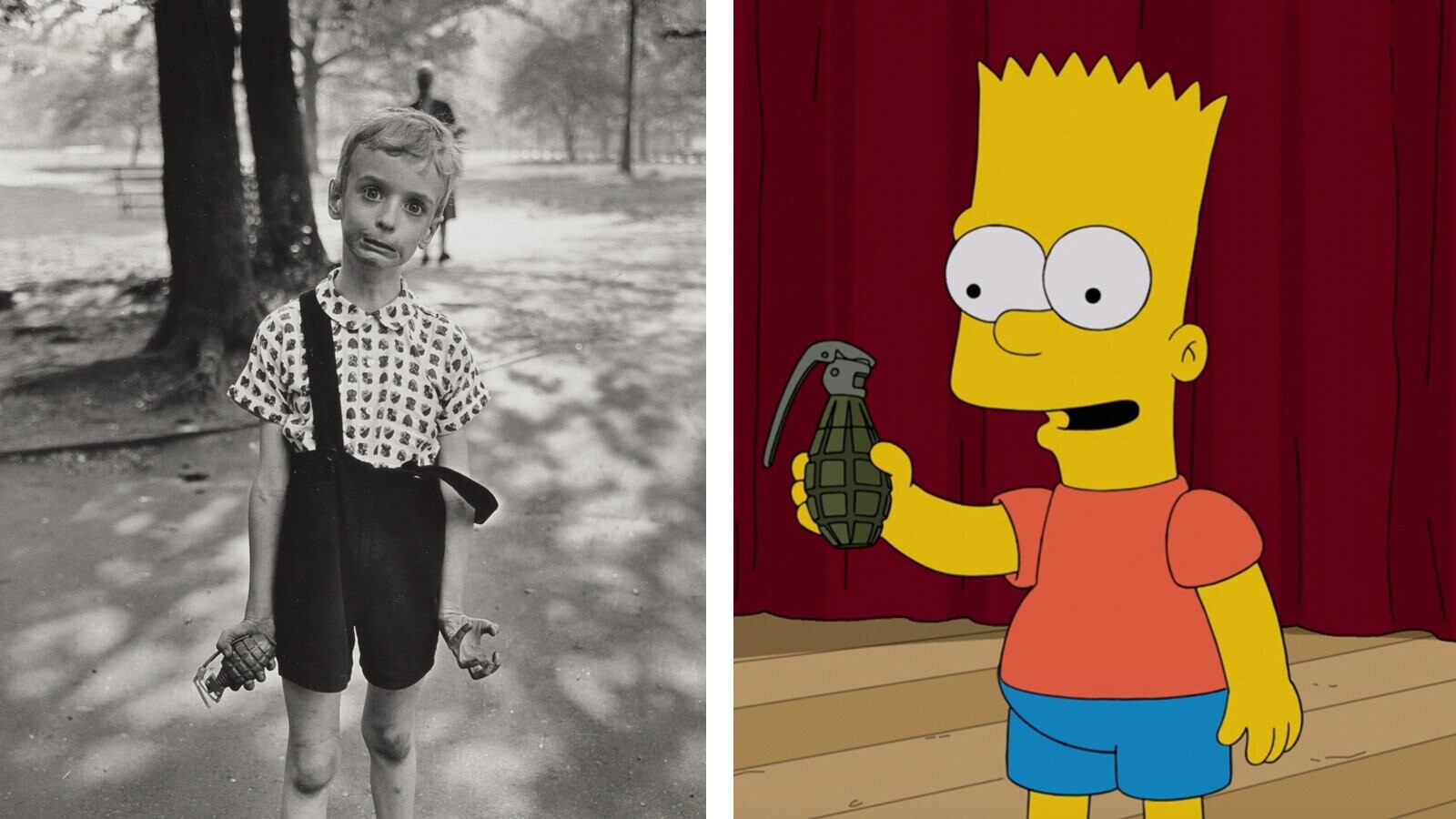 And as Simpsons writer Mike Reiss recently pointed out on social media, Bart also owes his existence to a famous work by legendary photographer Diane Arbus, “Child With a Toy Grenade in Central Park.” The photo, captured in 1962, depicts a young boy with a crazed expression on his face, who happens to be holding a replica explosive device, which apparently was a perfectly fine thing to let kids play with in the early 1960s.