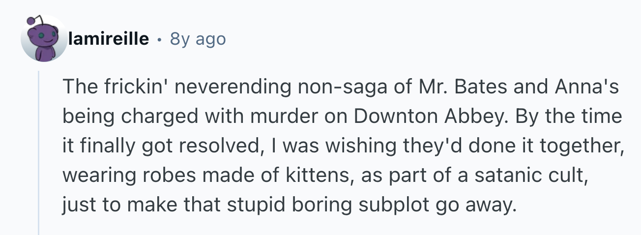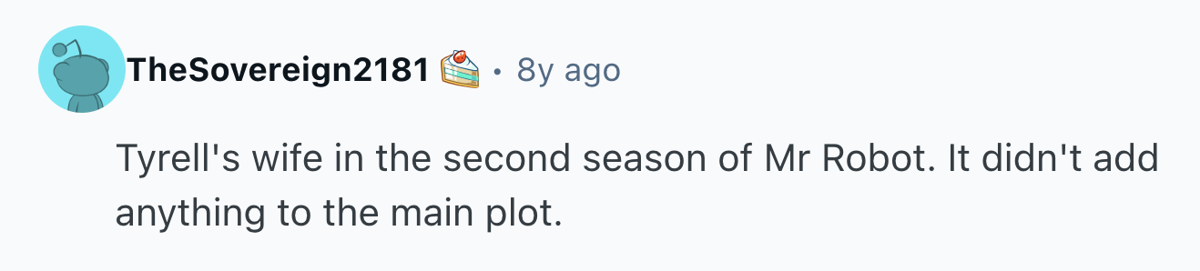 Sometimes, though, it feels like a movie or TV show is just taking us on a side quest because they didn’t know what else to do. It doesn’t add anything to the plot, and nobody is entertained, but the writers ran out of ideas, so now we’re all just along for the ride. That’s why one Reddit user asked r/AskReddit, “What subplot in a movie or TV show had you screaming, ‘Oh, my God, who the fuck cares?’”