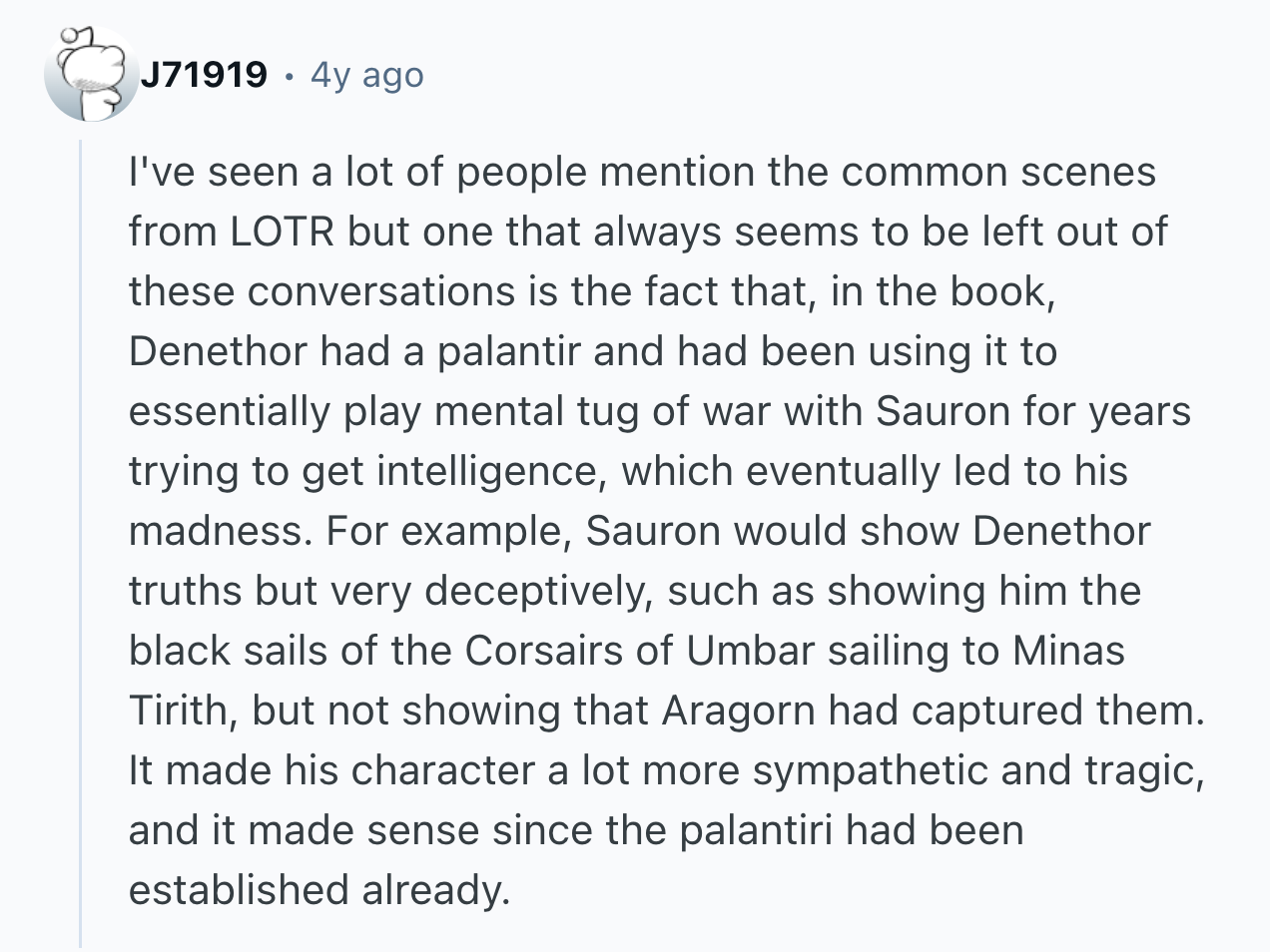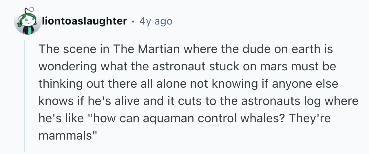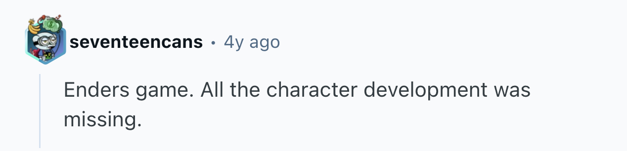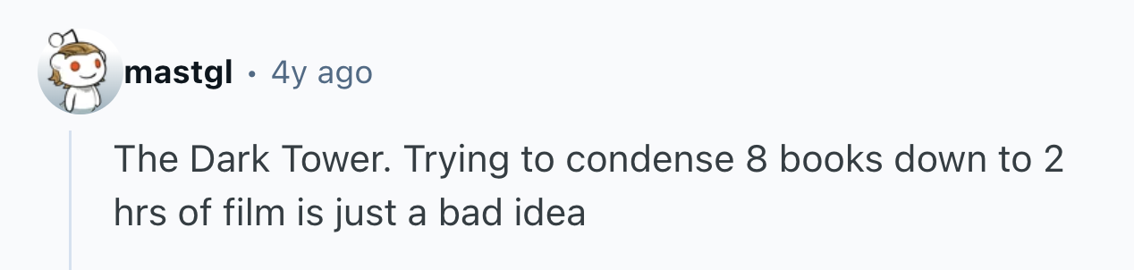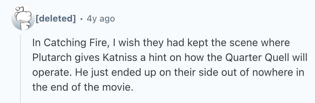 Aaaaand sometimes, they biff it. “The Hunger Games really got me a few times,” user suestrong315 told r/AskReddit. “The way Thresh kills Clove was a serious injustice for the first movie, but when they left out Haymitch’s Quarter Quell video with his interviews and then how he won, I was extremely disappointed. They glazed over his character development like he was a burden to be there at all… and fucking Suzanne Collins signed off on that!”