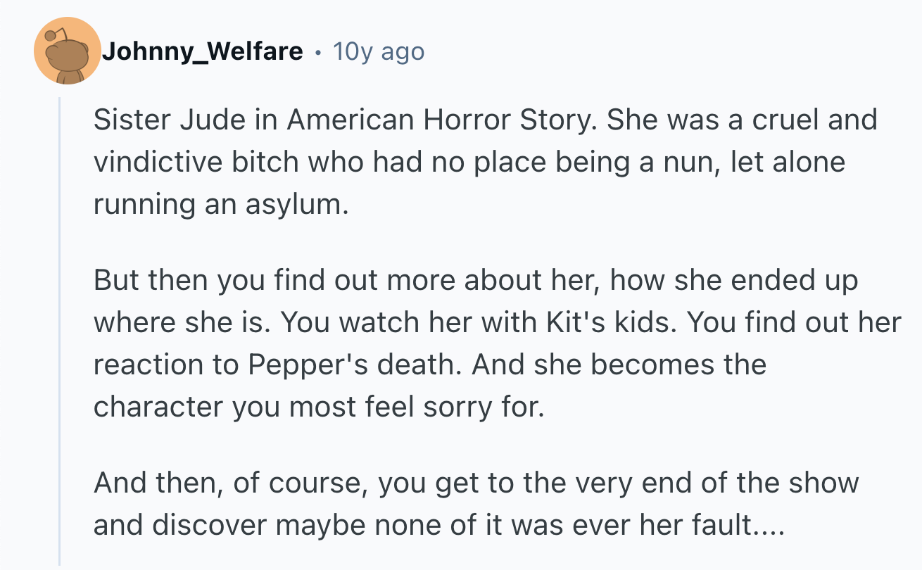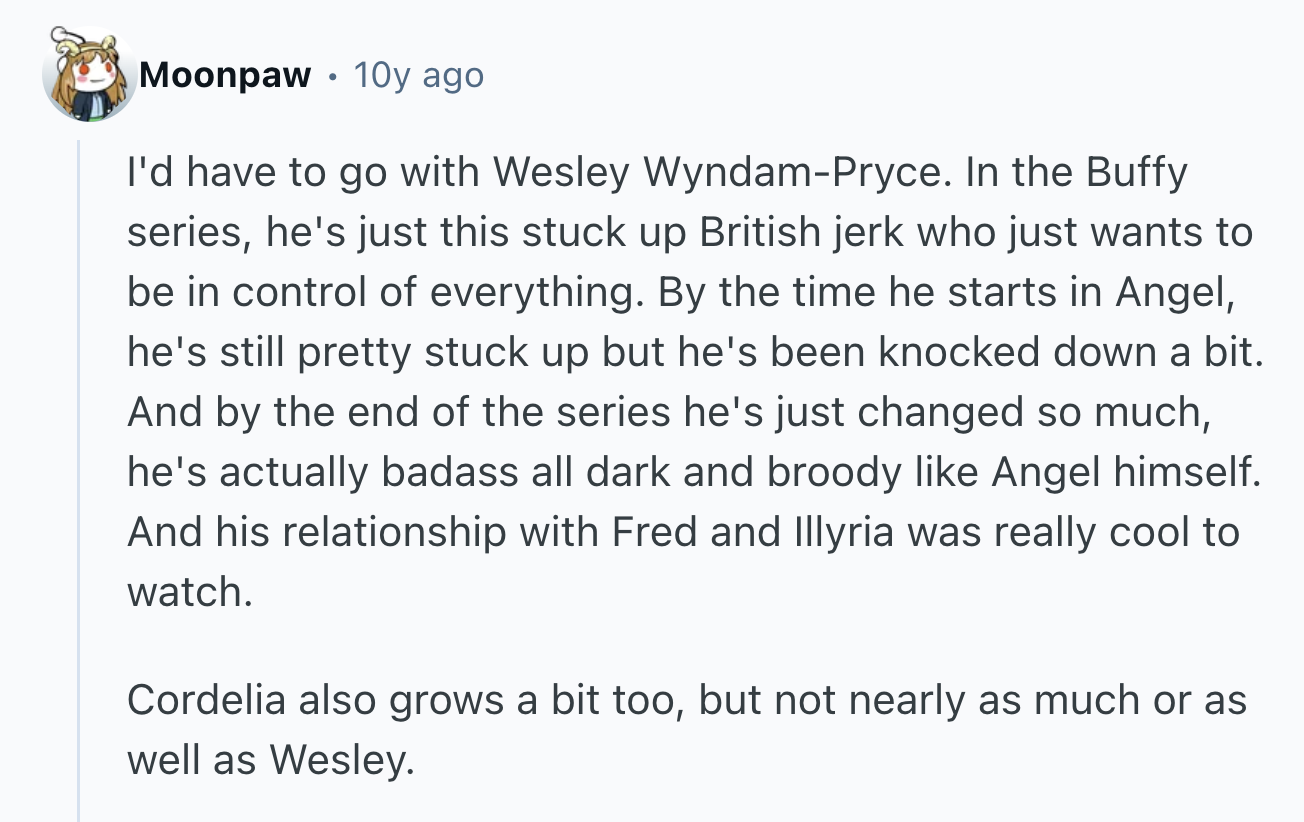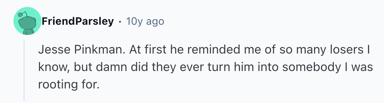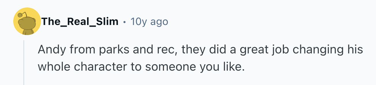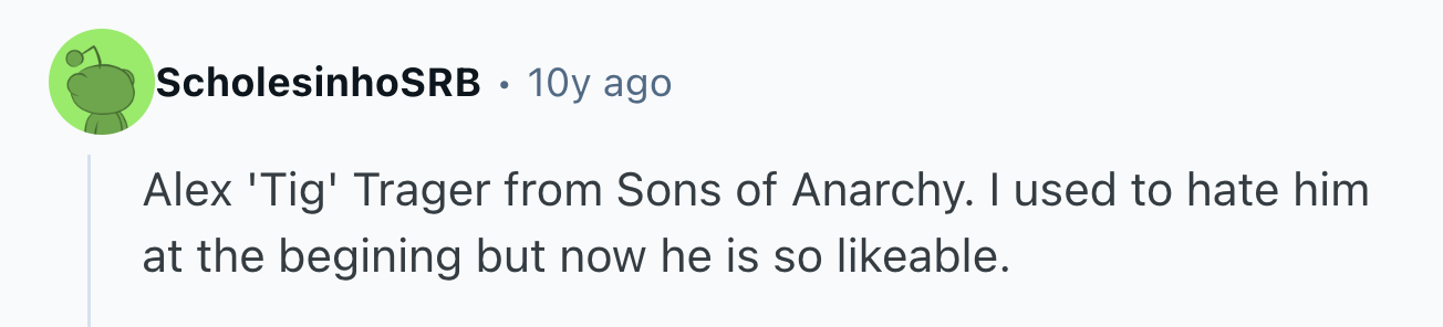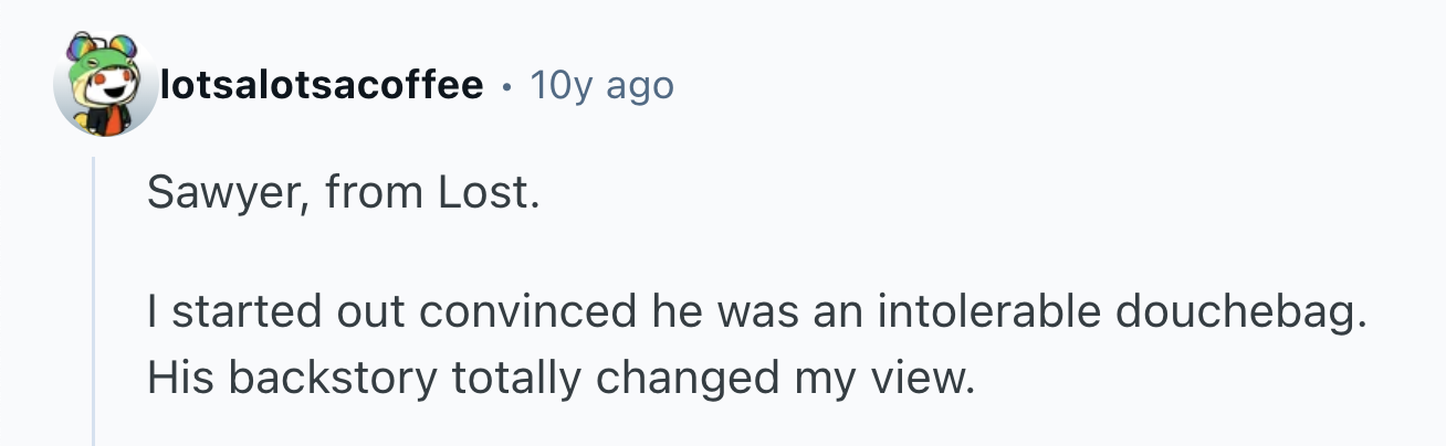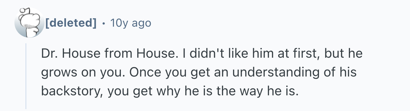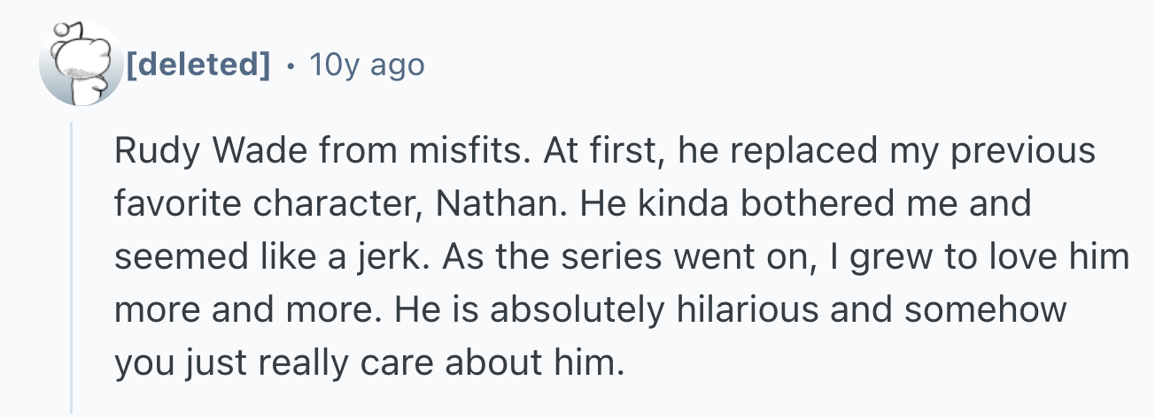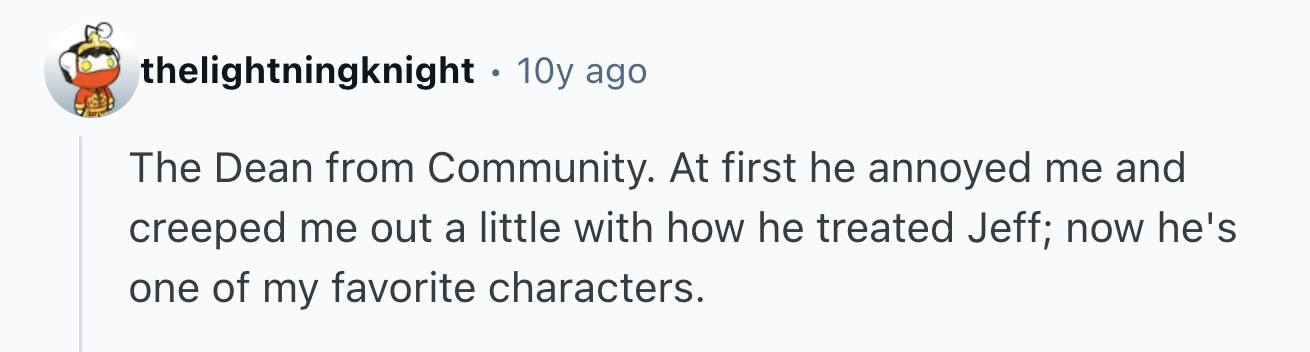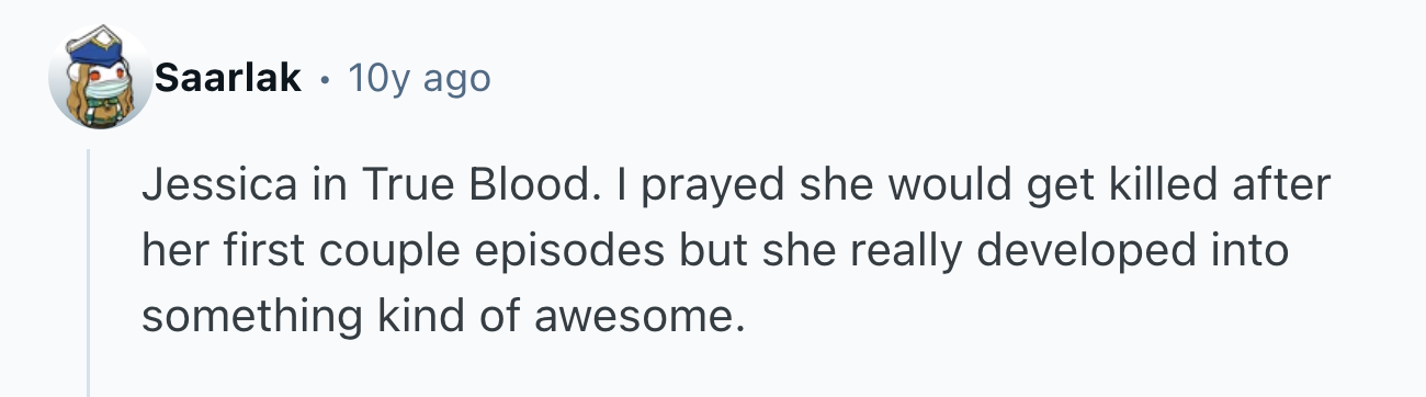 Sometimes, though, a character that started out as an irritating bag of fingernails on a chalkboard turns out to be a viewer favorite. The arc of history is long and bends towards fondness, so even the jackest of asses can grow on an audience. That’s why user Lystaireen asked r/AskReddit, “What characters did you find intolerable at first, only to love them when they grew in their story?”