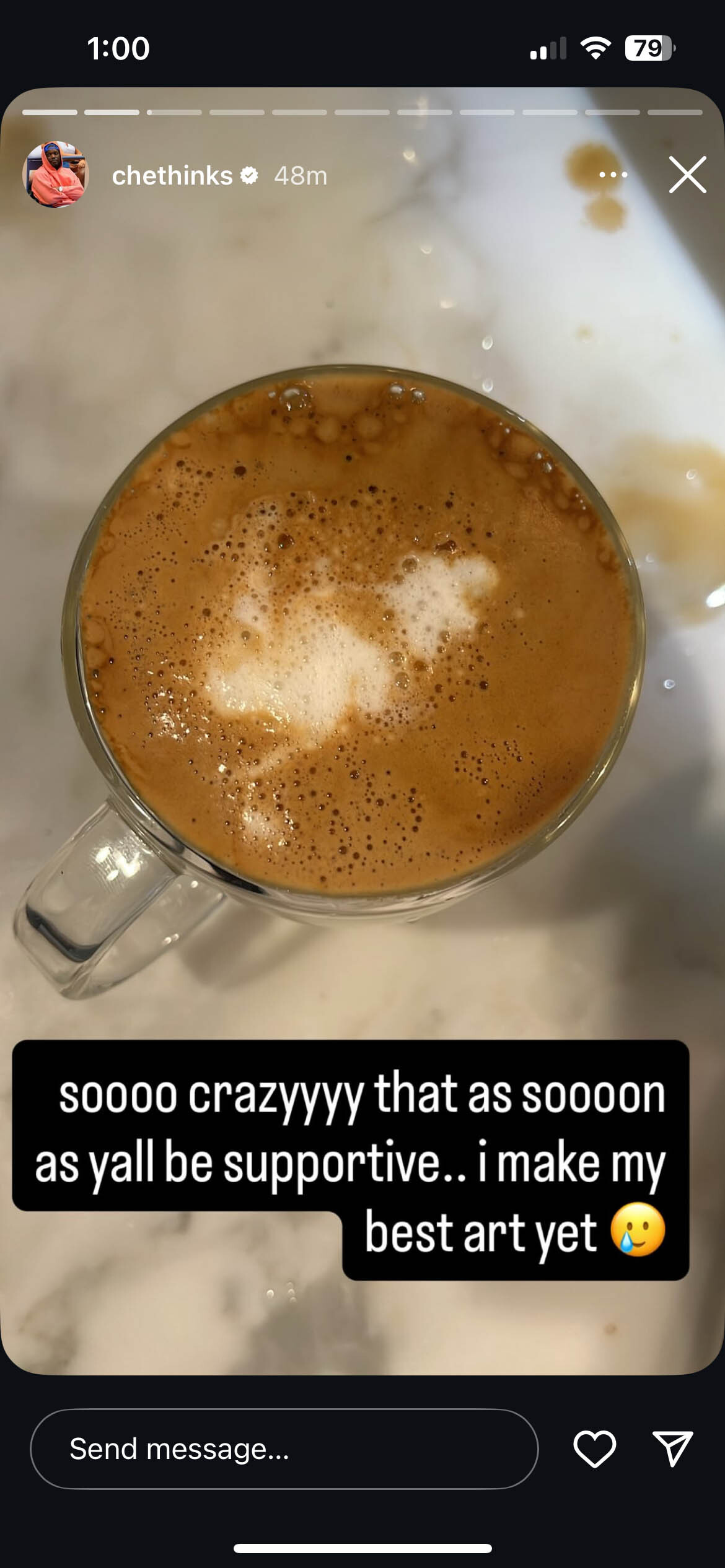 He followed that up with a promise to take his espresso machine and go home. “i received a TON of negative messages these past few days about my latte art.. so ive decided to stop posting them here. yep. you won’t have ol mikey che to kick around no more!”