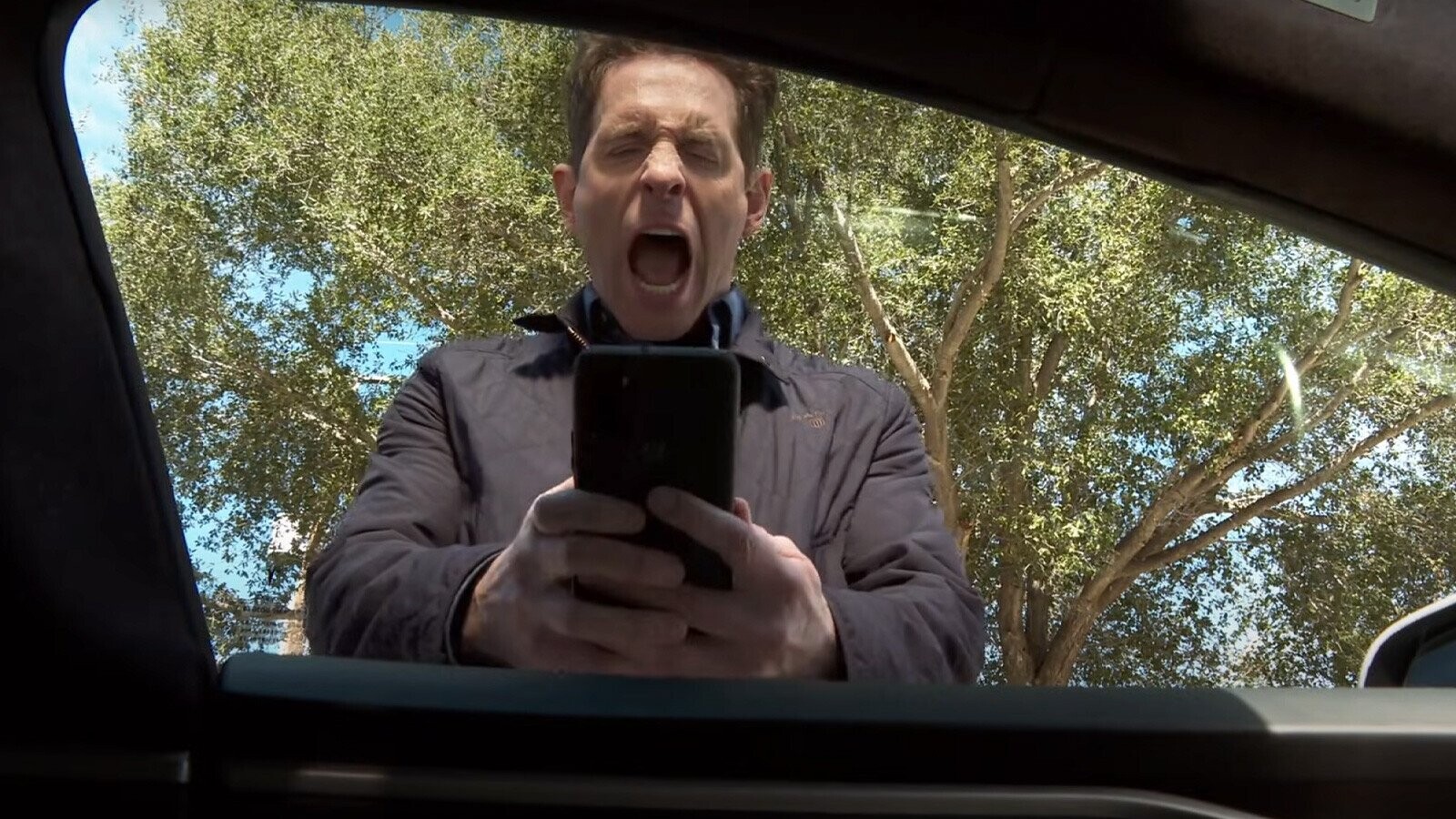 With his neck veins bulging and his face beet red, a la his character’s reactions to questions about his human-skin furniture, Howerton tried to cool things down by calling AAA to help him get out of this jam. But more problems arose when he couldn’t get his Tesla into “tow mode.”