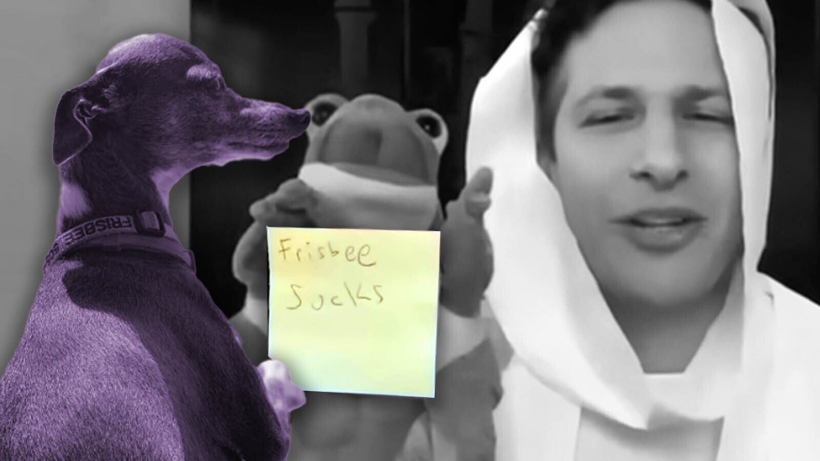 While Frisbee was a frequent guest on Late Night with Seth Meyers, the pooch is best known as the archnemesis of Meyers’ old Saturday Night Live costar Andy Samberg. In an audience Q&A just a few months ago, the late-night host explained just how deep the animus had become.