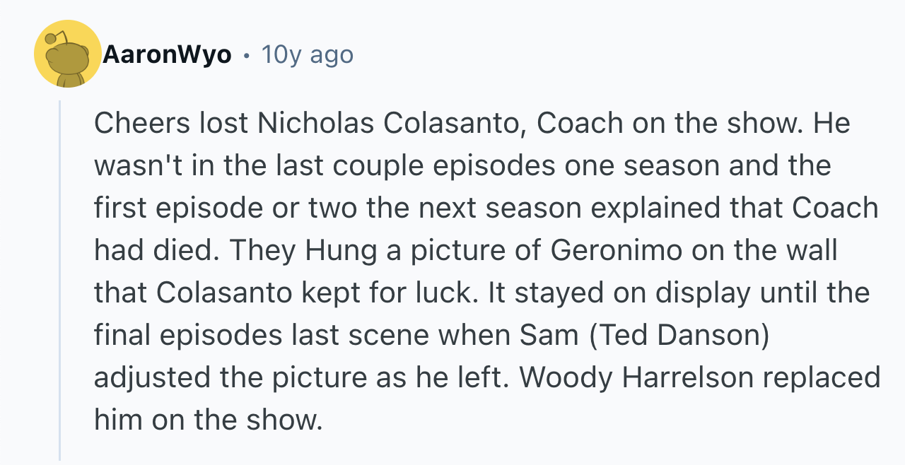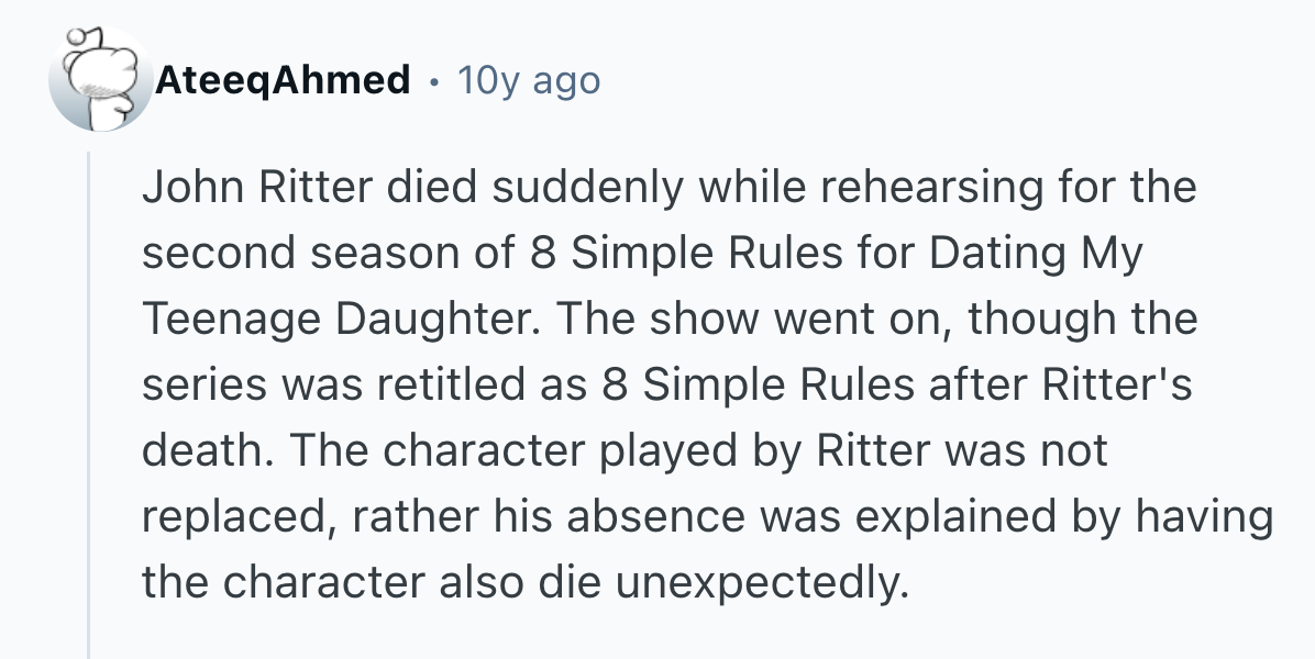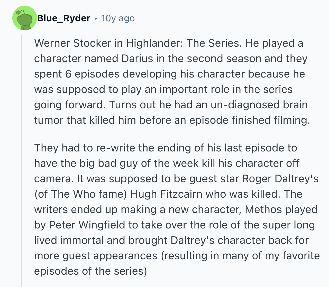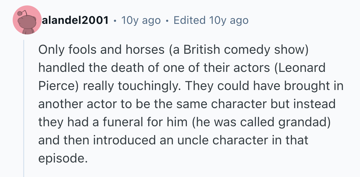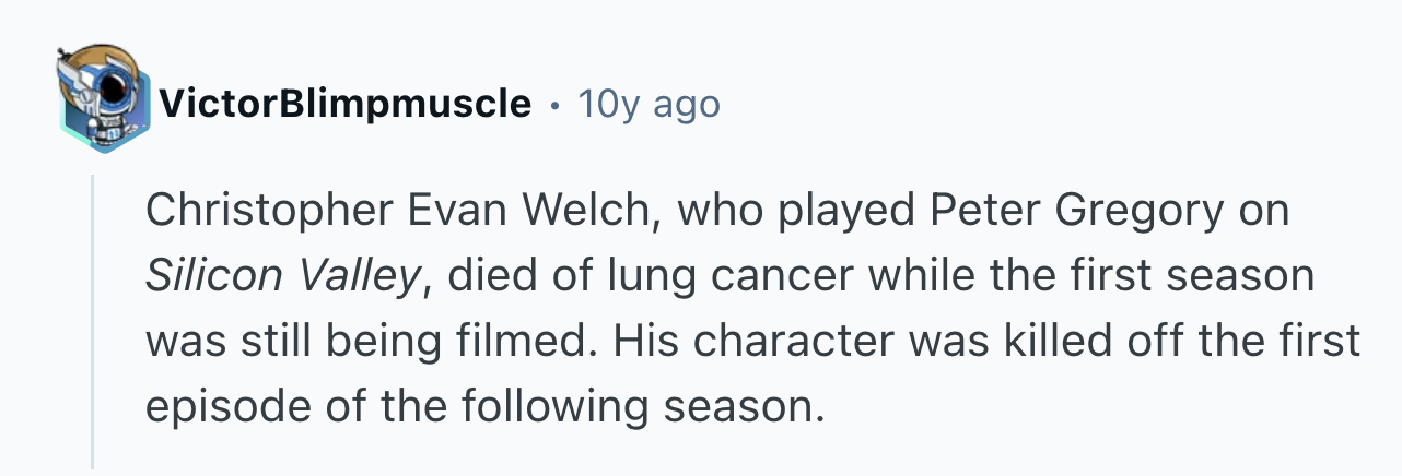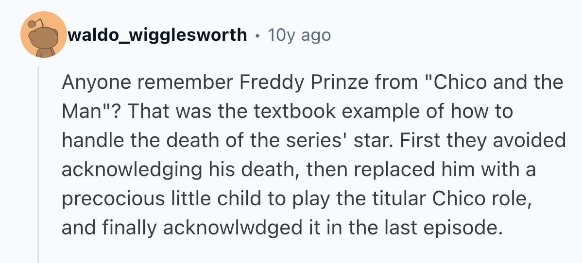 When it happens, TV shows have a number of options. The most obvious one is to kill off the character as well, but that’s not always the best route (say, in a lighthearted comedy) or even remotely responsible (say, a show whose target audience is toddlers). That’s when writers have to get creative. To find out how many ways they’ve coped, user MyHairIsAHotMess asked r/AskReddit, “What TV show has had to handle an unexpected death of an actor? How did they do it?”
