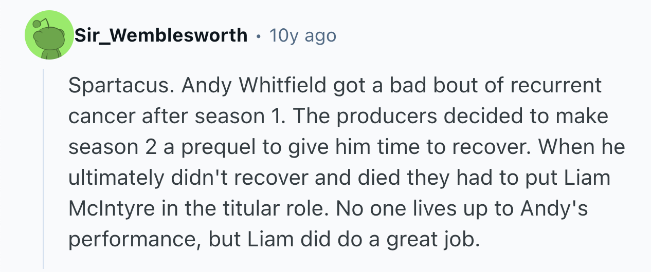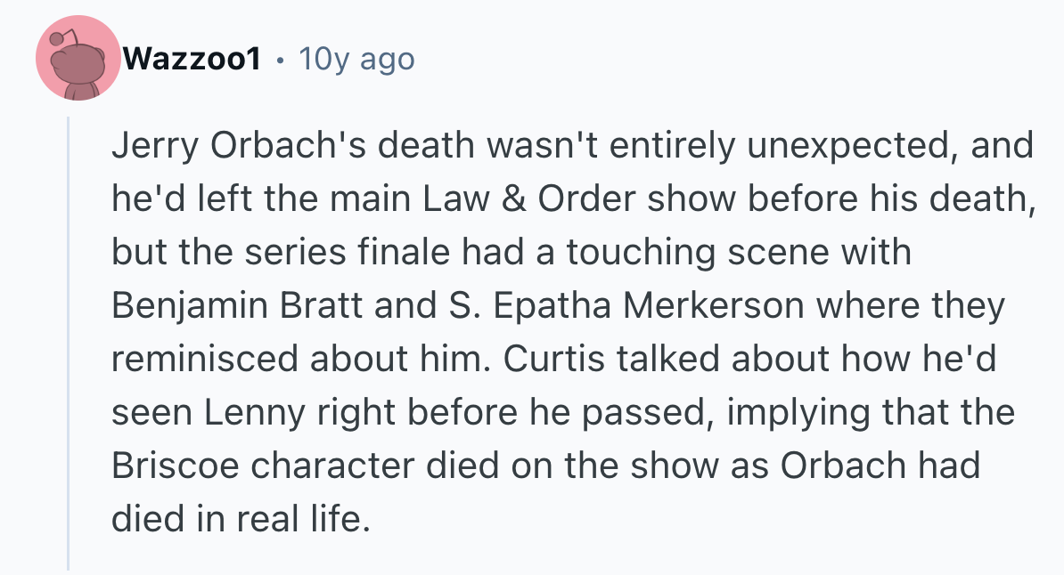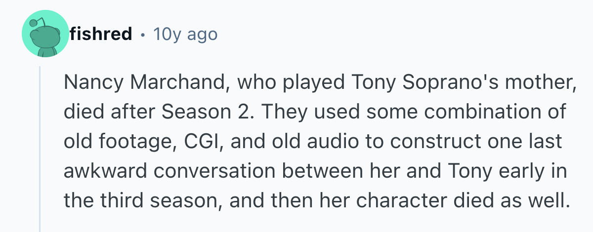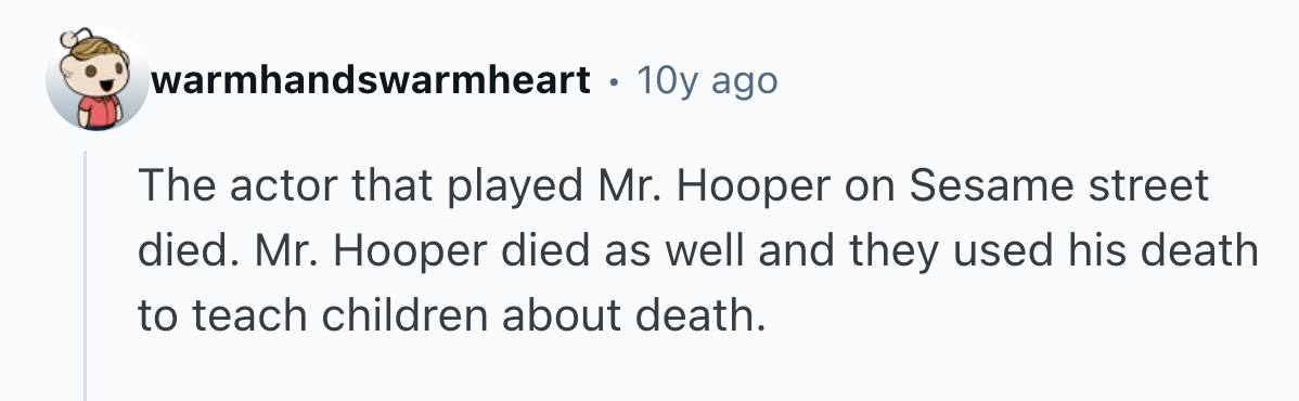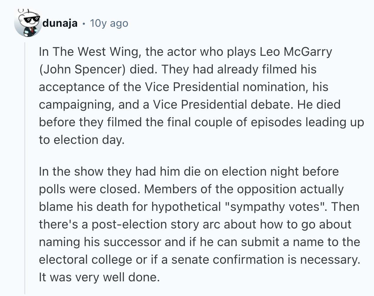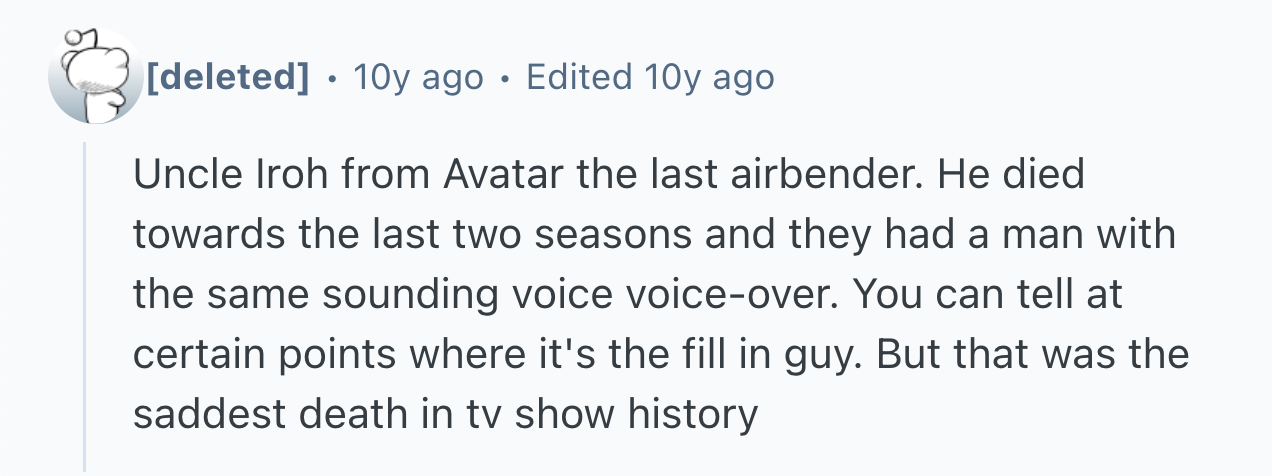 When it happens, TV shows have a number of options. The most obvious one is to kill off the character as well, but that’s not always the best route (say, in a lighthearted comedy) or even remotely responsible (say, a show whose target audience is toddlers). That’s when writers have to get creative. To find out how many ways they’ve coped, user MyHairIsAHotMess asked r/AskReddit, “What TV show has had to handle an unexpected death of an actor? How did they do it?”