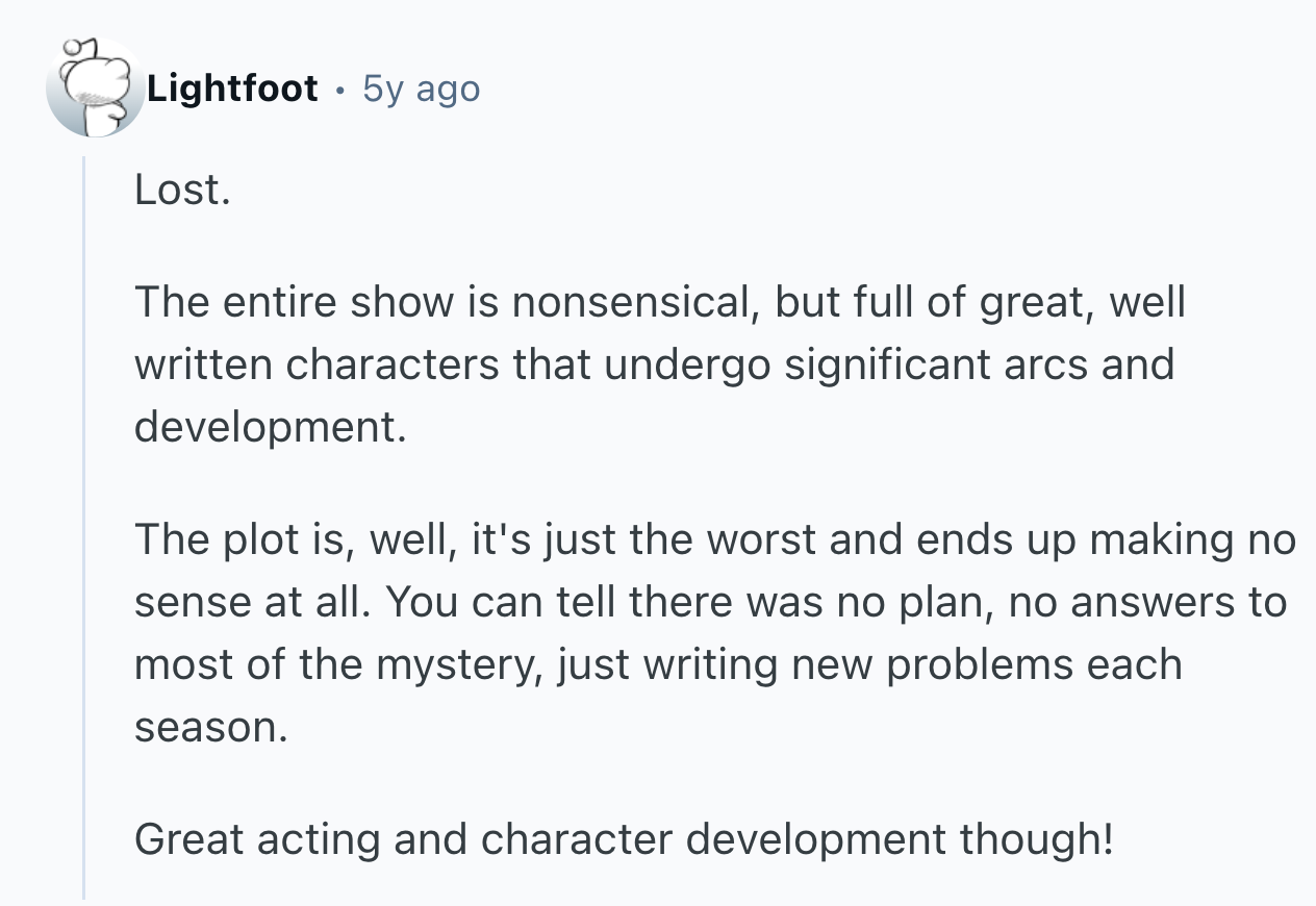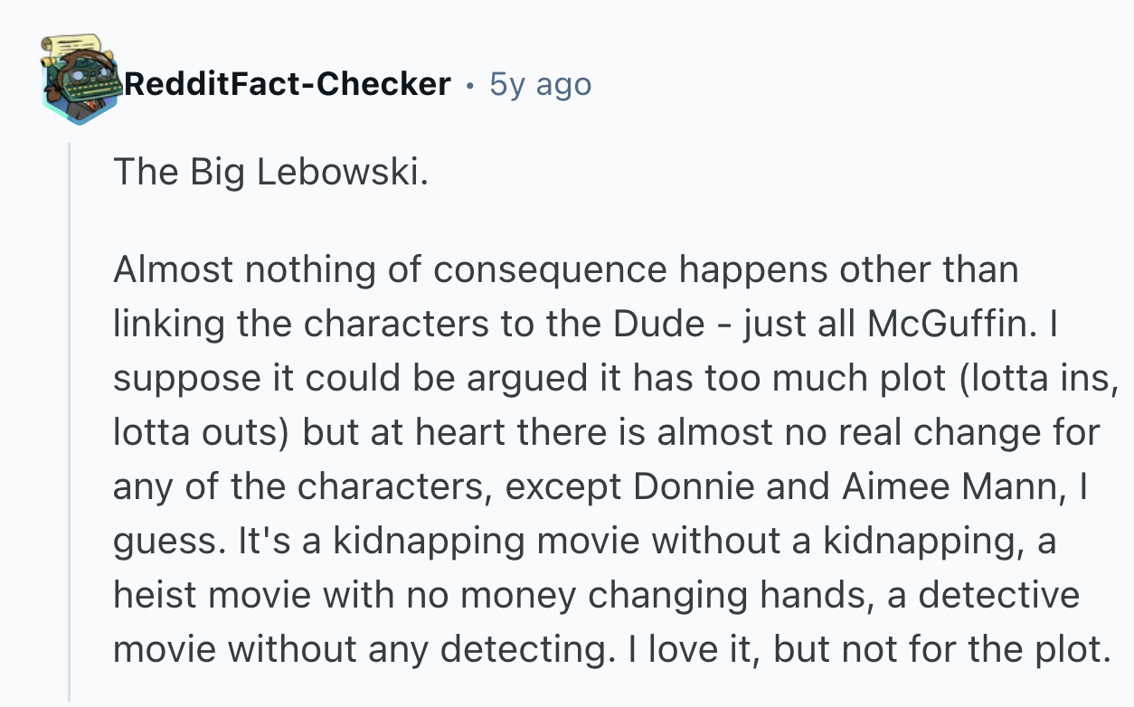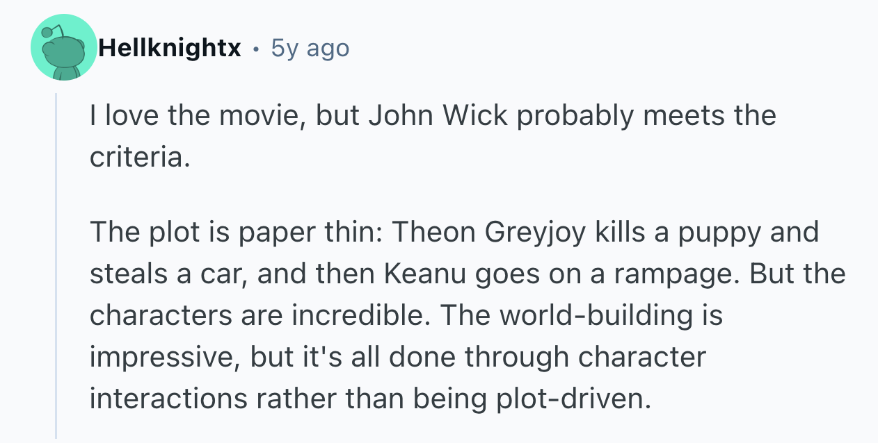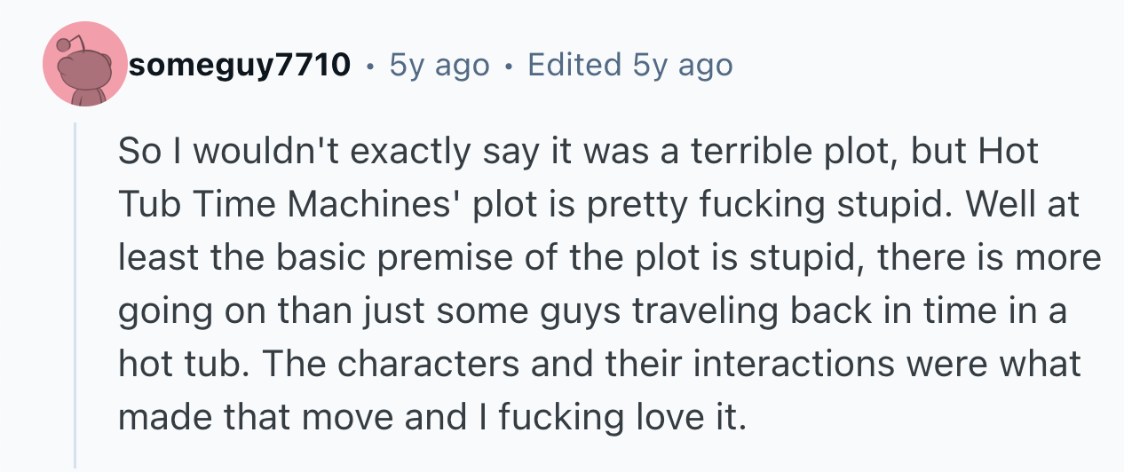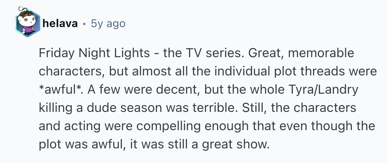 If you have to sacrifice something, though, characters should be the last on your list. The setting can be mundane, the strippers can be tired, even the story can take a backseat. As long as you've got fascinating characters, people will watch them watch tanning spray dry and have a great time doing it. That’s why user klowyuwu asked r/AskReddit, “What story had a terrible plot but great characters?”