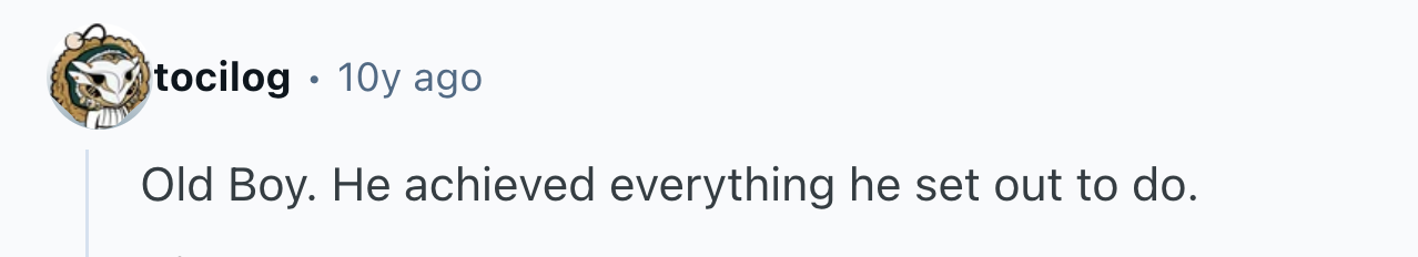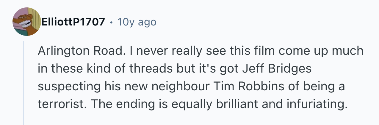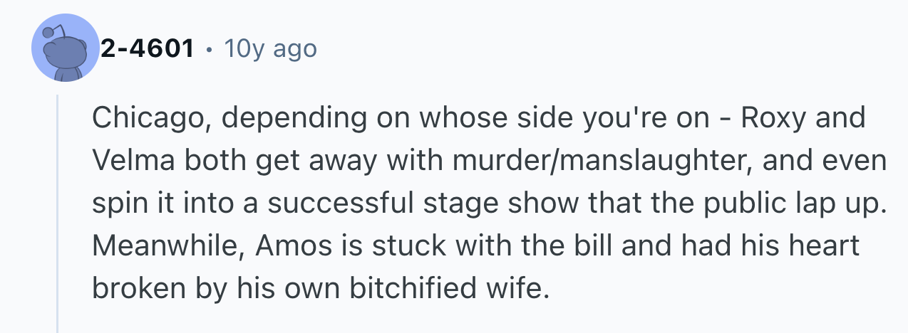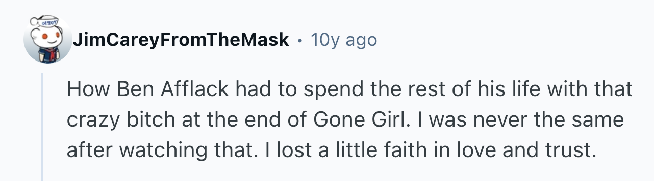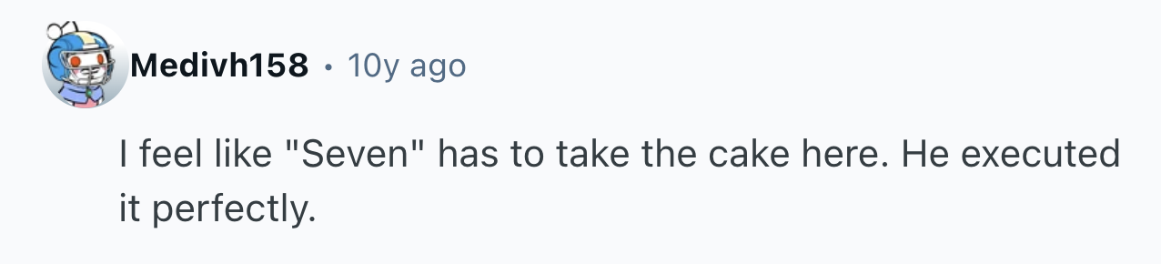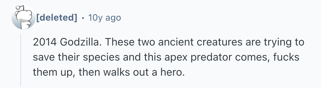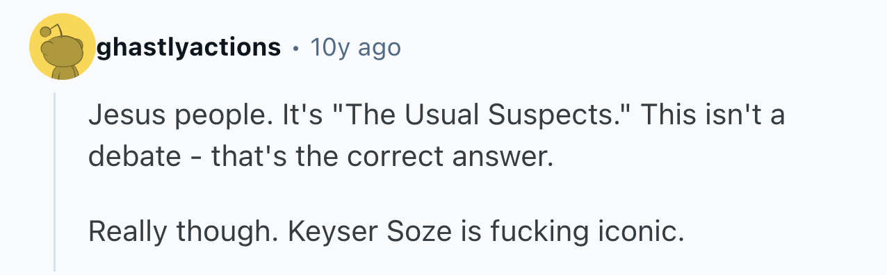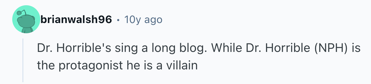 Or do they? Can an ending be satisfying if justice fails to be served and they’re not just setting up an Endgame-style sequel? We would argue yes, and so would Redditor OptcPsi. Granted, they cite “FOX when they cancelled Firefly” as one such ending, and we suspect they, along with every other nerd we know, don’t consider that a good ending at all, at least not according to the frowny emoticon they tacked on.