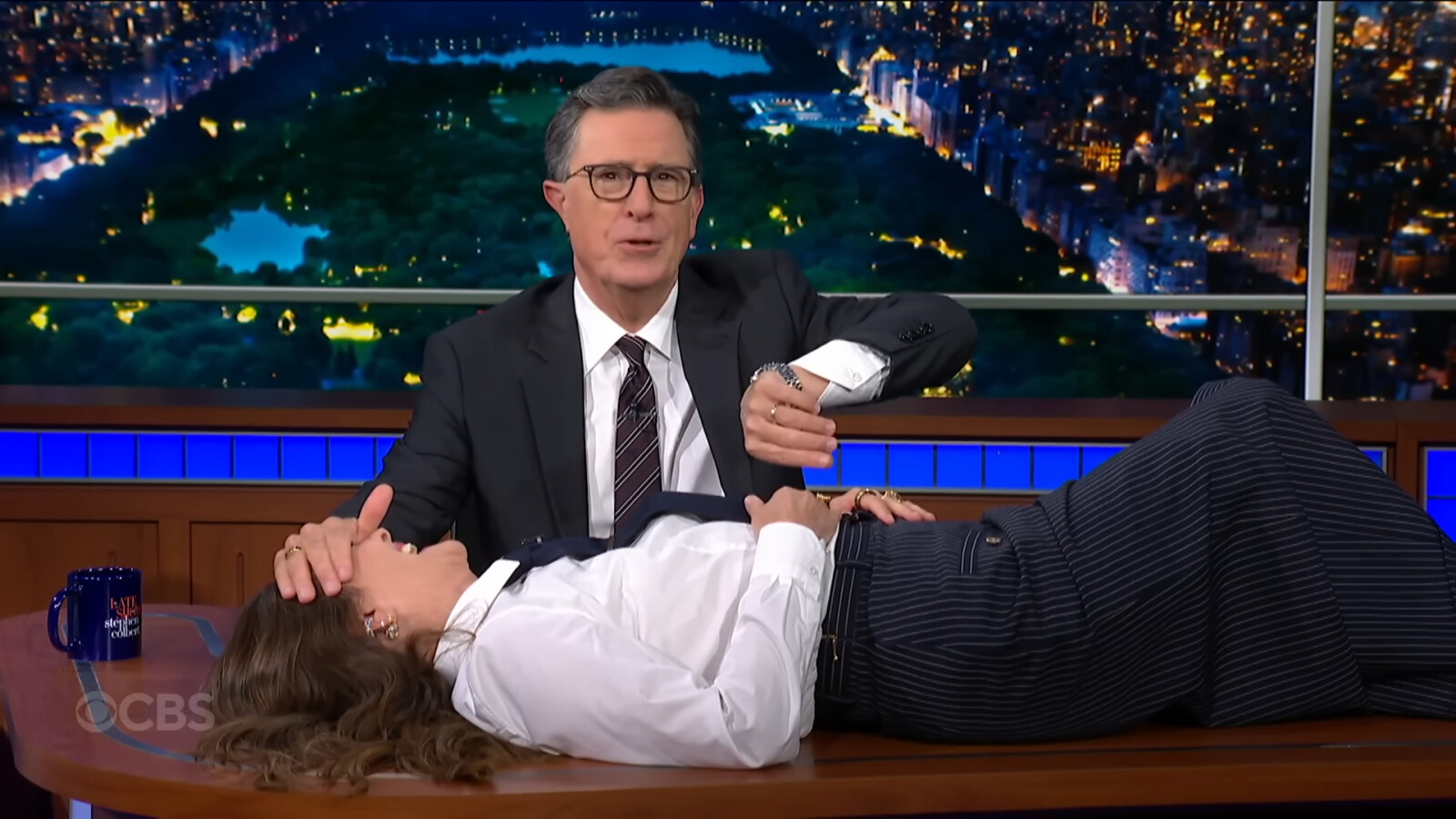 Barrymore laid back on the desk and gazed up at Colbert, who put a hand on her forehead to detect a possible fever.