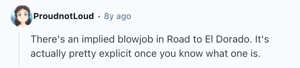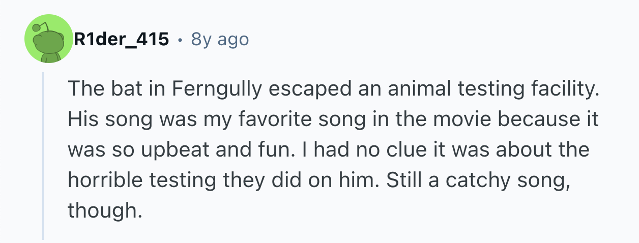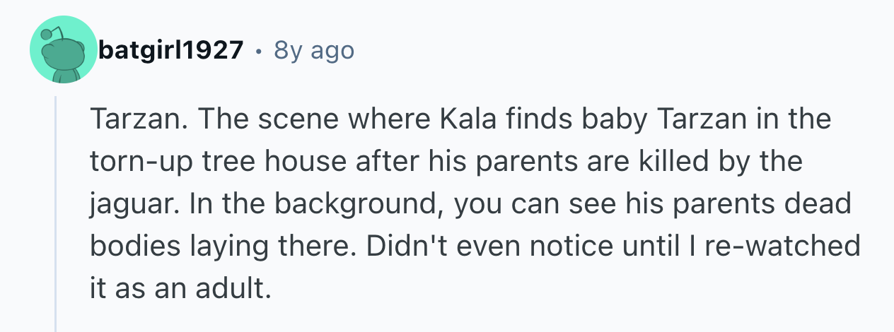 For example, “The coach in Mighty Ducks was sentenced to community service after drinking and driving,” user fred311389 told r/AskReddit. “The community service was coaching the kids. So, this great coach a team because of a DUI.” Furthermore, “in Tarzan, at the end of the fight between Clayton and Tarzan, you can see Clayton’s silhouette essentially hanging to death during the lightning storm.”