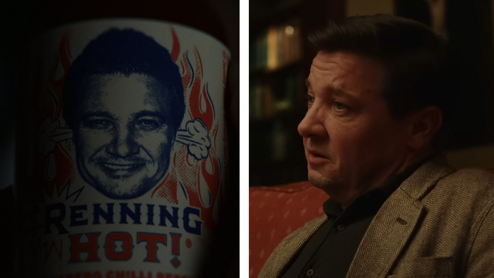 Fans may recall that Glass Onion included a joke about Renner releasing a line of “small batch hot sauce.” In exchange for the opportunity to invest in the company run by the Elon Musk-coded Miles Bron, Renner sends the billionaire “a pallet every year.” Each bottle of “Renning Hot” features Renner’s grinning face, with steam shooting out of his ears. We hear about the hot sauce before ever seeing the label, making the reveal even funnier.