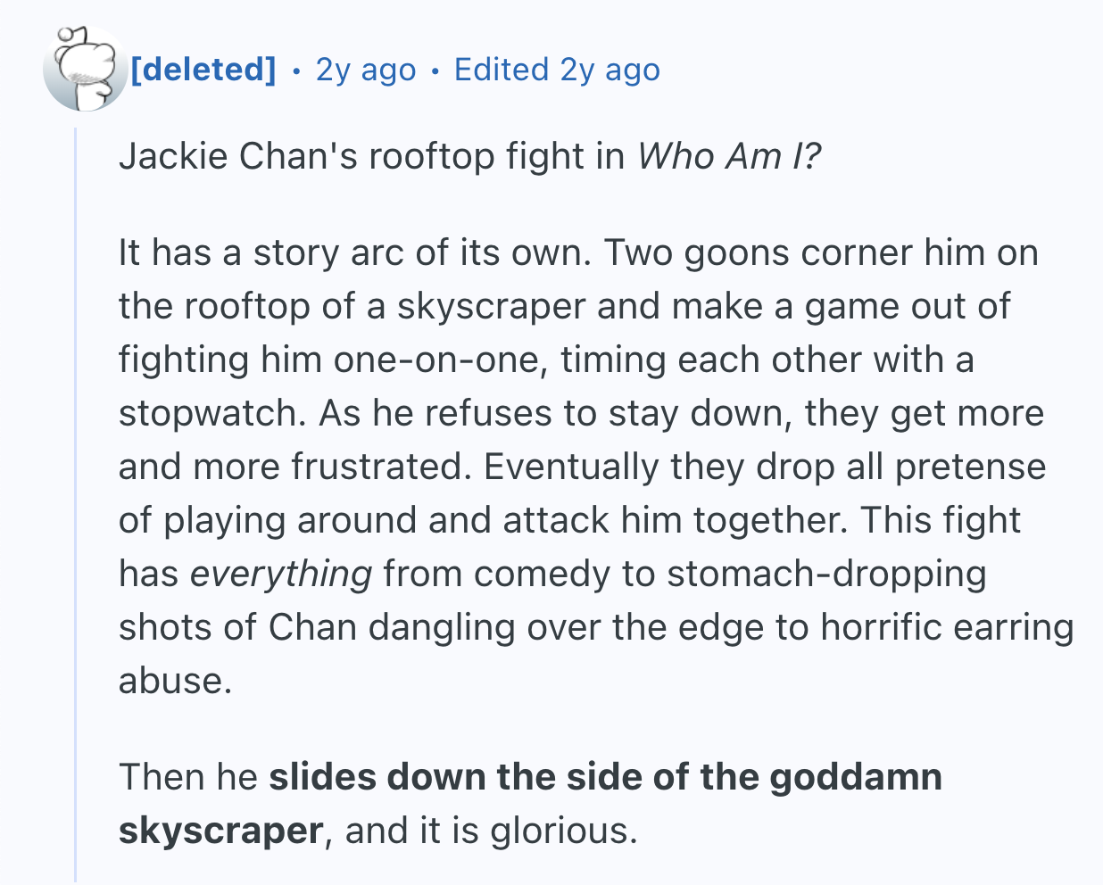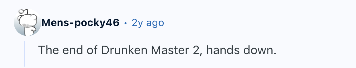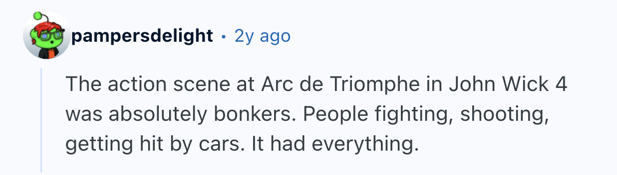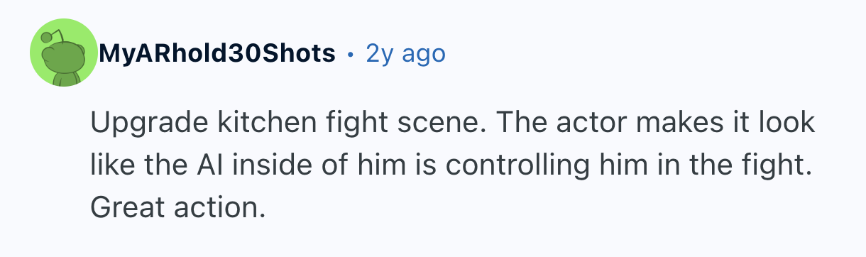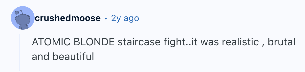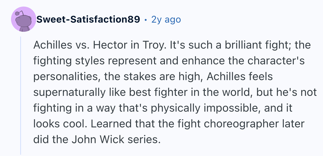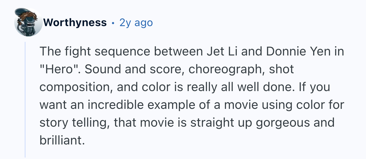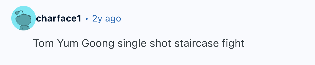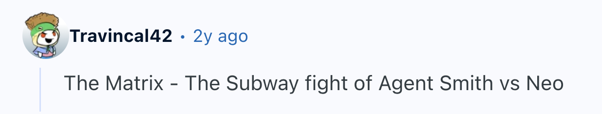 And just like a good romance, sometimes nothing else matters in a movie. terrencethetomato insisted they “don’t care too much about a good movie,” they just wanted to watch “a fight scene that was, well... impressive.” They then asked Reddit to name the “best choreography for fight/action scene?” and a bunch of fighting words followed.
