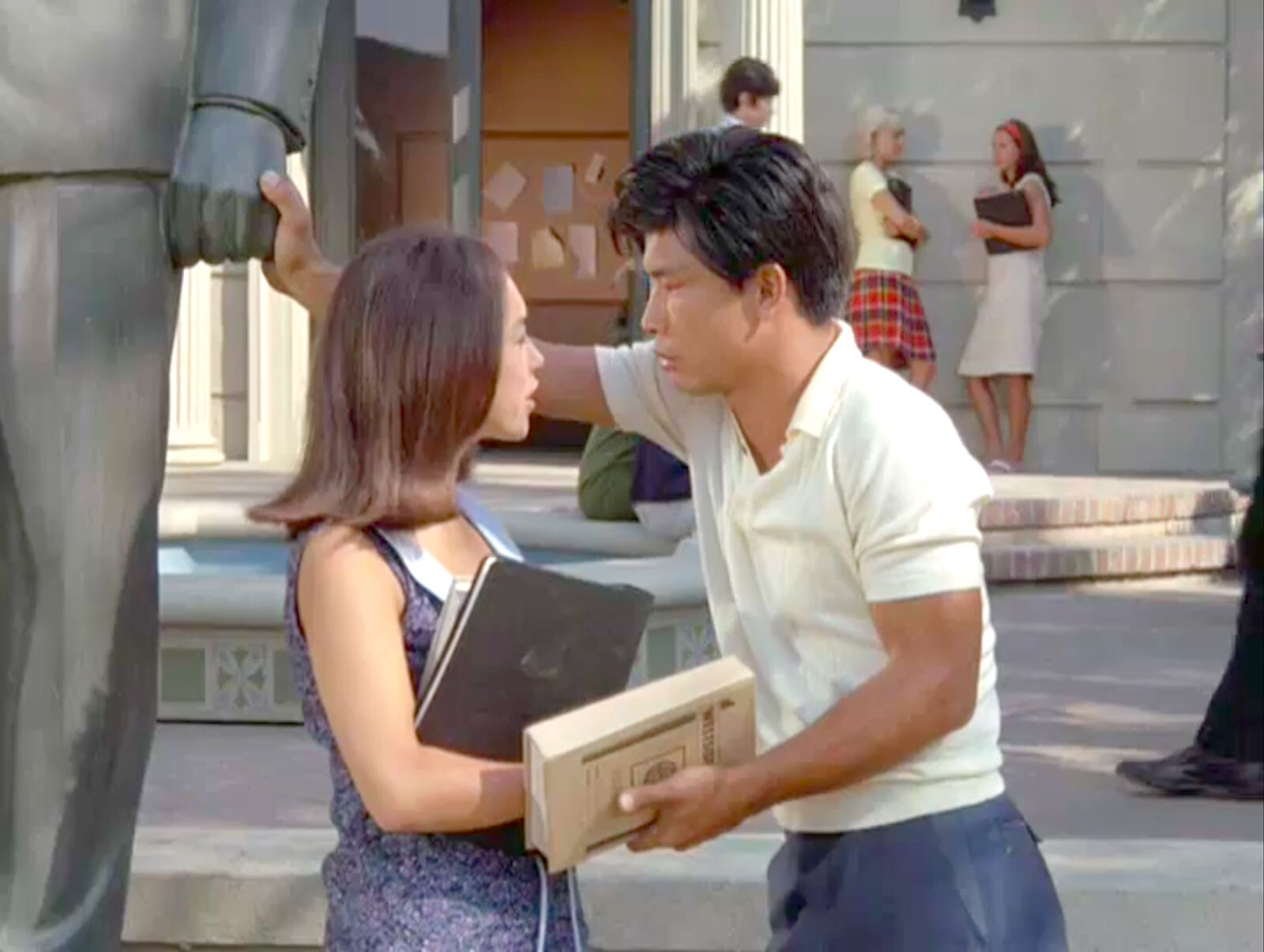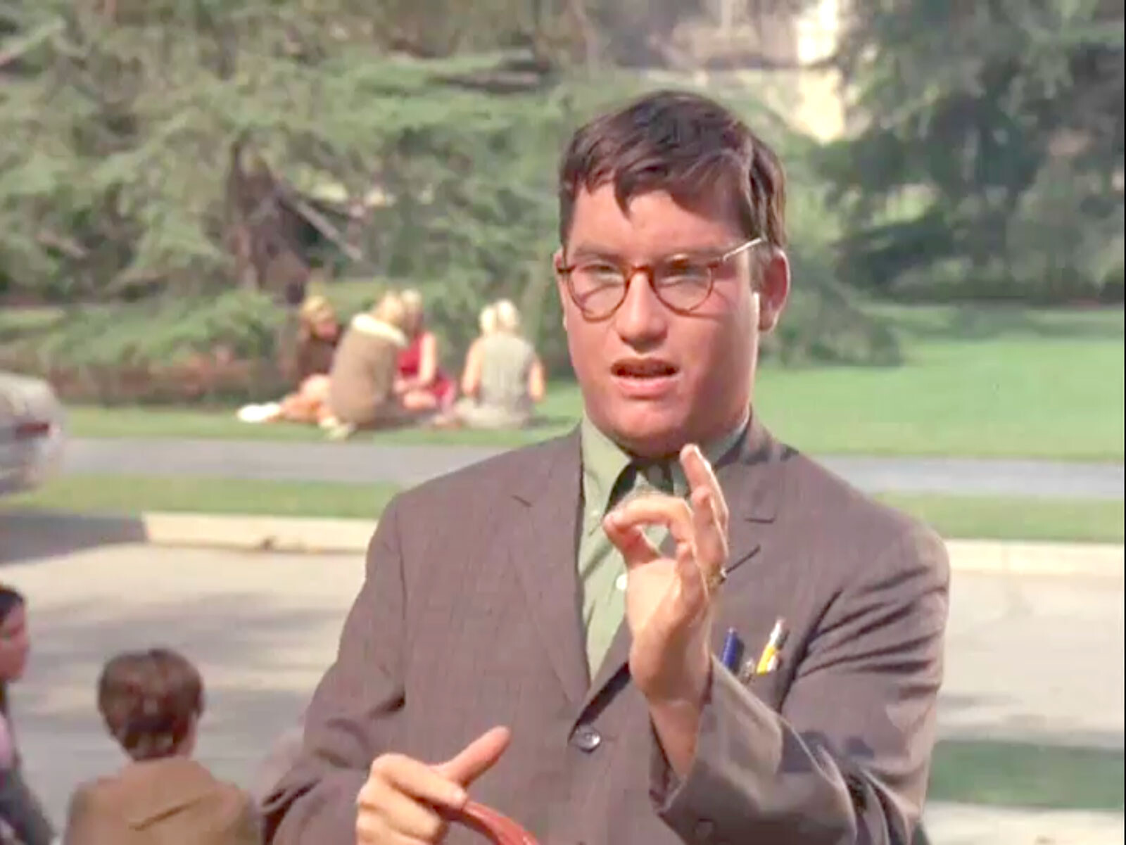 Gidget’s strike on the theater makes news, at which point a higher-up in UCLA’s alumni organization dispatches someone to warn Russell to quell Gidget’s campaign before the unrest spreads to campus. When Russell reluctantly tries to talk to Gidget about it, he’s vague about the causes he supported when he was her age — you know, the second world war and the fight against Nazism — and tries to tell her what a wonderful world she’s growing up into. There is no mention that protests on campus might be about the Vietnam draft or the civil rights movement.