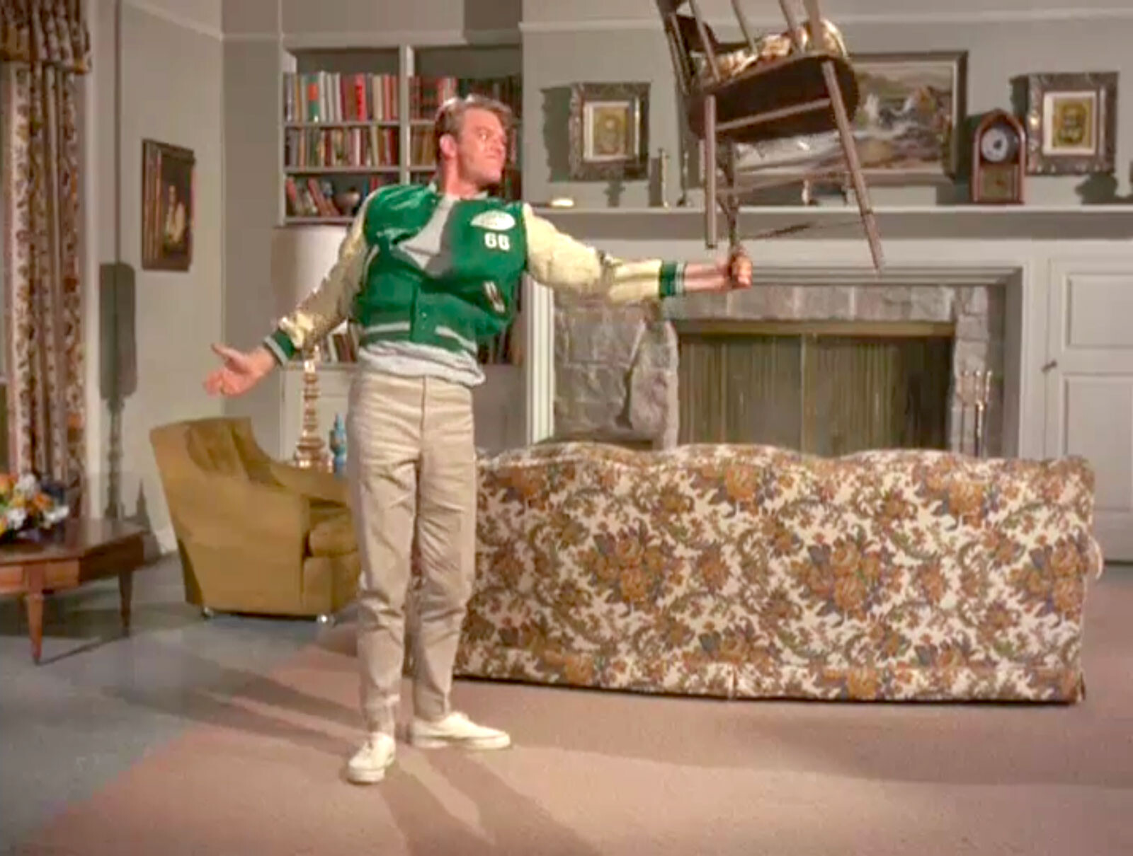Representation of guys from Bensonhurst takes a hit in “Ego a Go Go.” Chuck (Ed Griffith) is a football player taking remedial English from Russell so that he can maintain his eligibility; he believes Russell’s daughter and her friend are named “Gadget” and “Leroy,” but at least he can lift a chair on one hand!