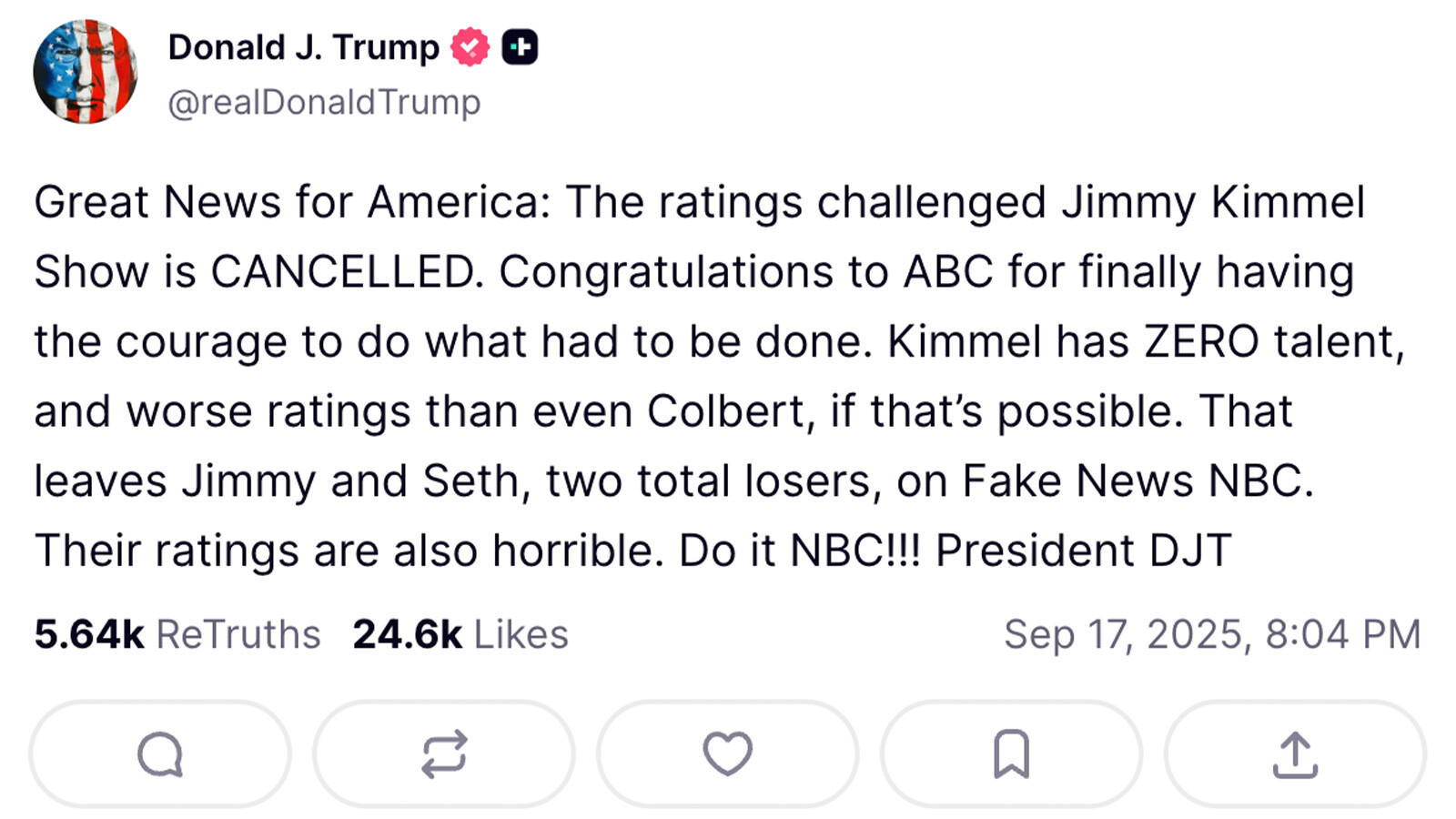 “The ratings-challenged Jimmy Kimmel Show is CANCELLED,” the president began a post shared to Truth Social on Wednesday evening. “Congratulations to ABC for finally having the courage to do what had to be done.”