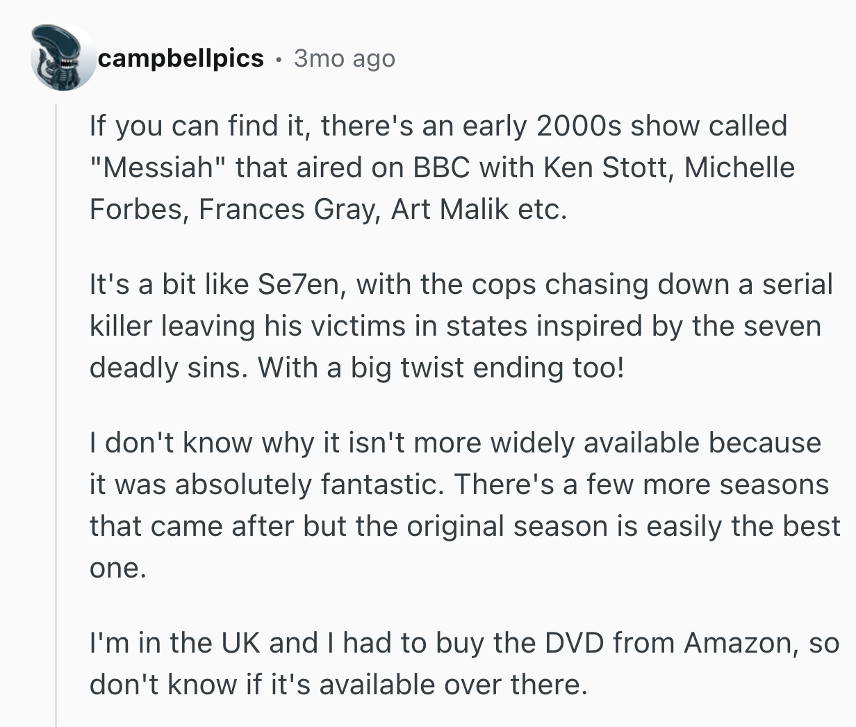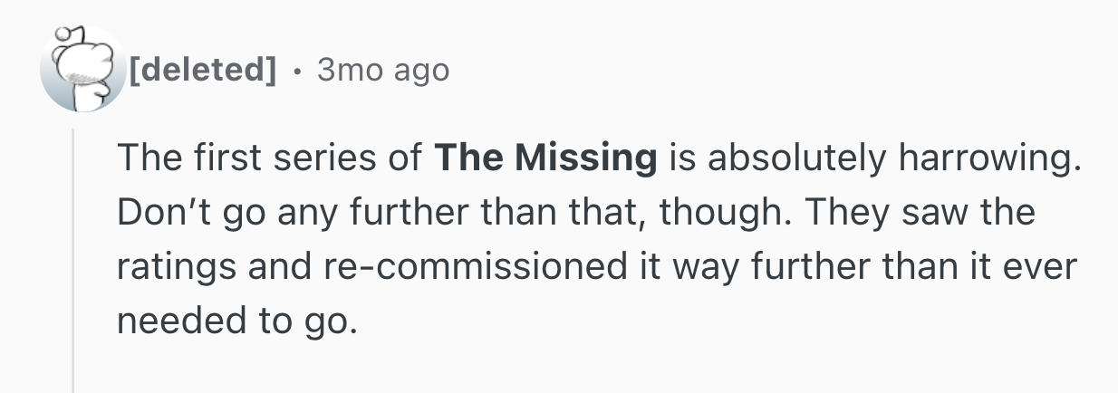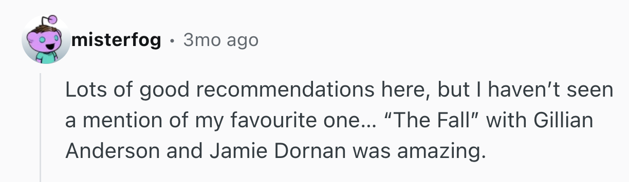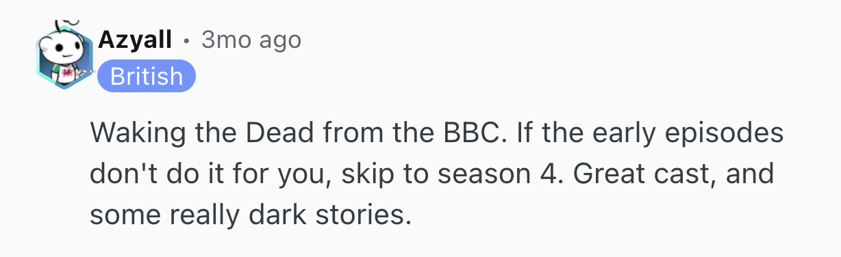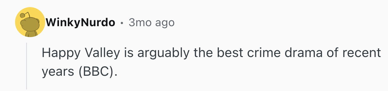 Redditor muertossparrow, an American, found that out the hard way. “I recently watched The Killing (American version), which led me to The Fall, Broadchurch and Deadwater Fell,” they told r/BritishTV. “I usually watch shows while I’m on the treadmill, and I have been staying on longer to keep watching,” they joked. “My workouts have been flying by, and I need more show recs for this week after Deadwater ending where it did tonight on episode four! I thought I had a few more days before I had to find something.”