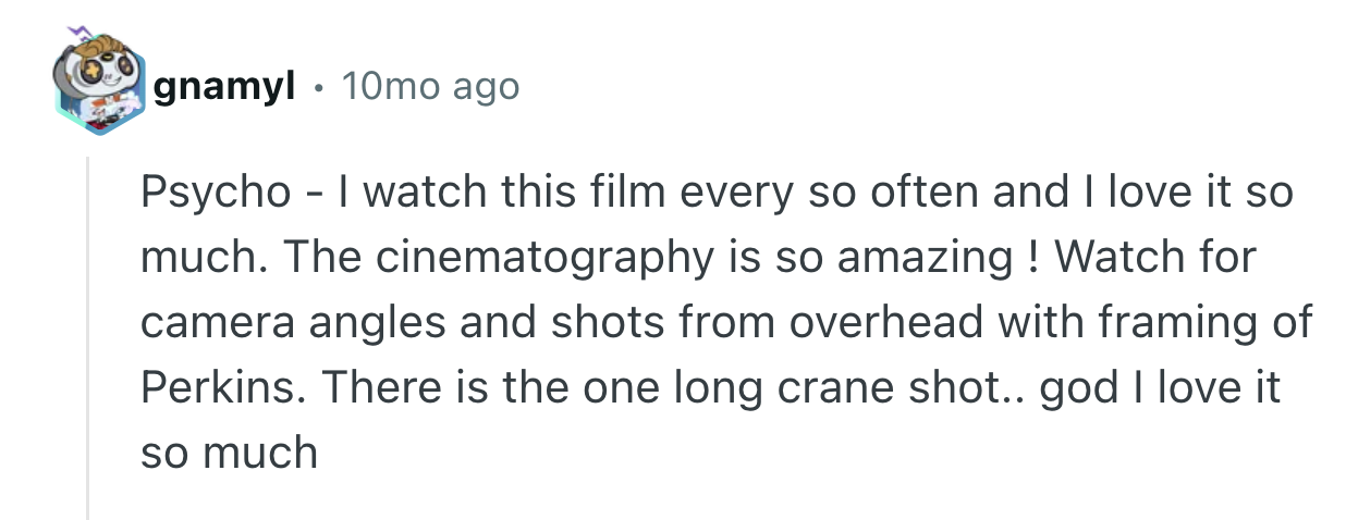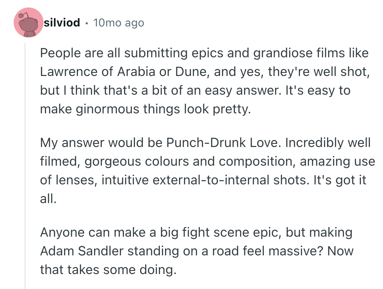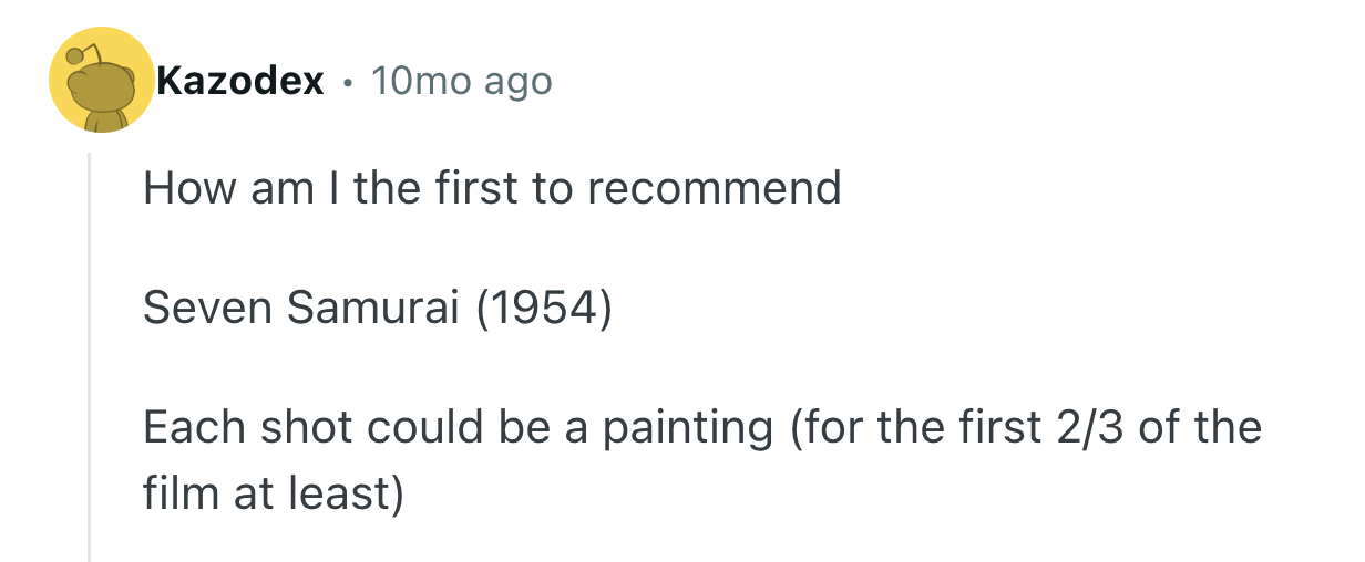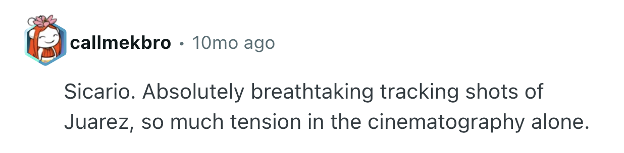 Redditor shawtyisdrunk is a member of that audience. “I’m looking for films that will completely blow my mind visually, ones with shots that’ll leave me speechless,” they told r/MovieSuggestions. “Even though I’ve already watched a lot of the movies with incredible cinematography … I’m still eager to find a few hidden gems or some that maybe I missed.”