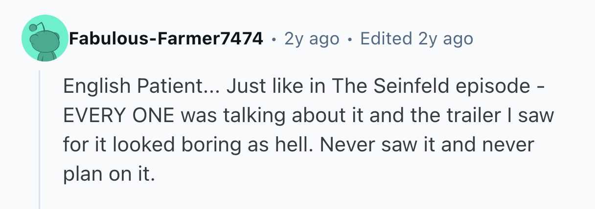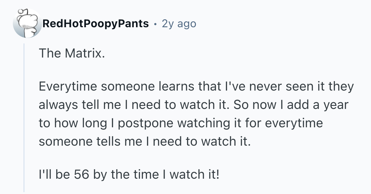 But sometimes, you miss the boat. You got busy that month, and by the time things slowed down, all the online chatter made you feel like you’d already seen it anyway. Maybe a certain classic has just remained stubbornly at number 43 on your to-be-watched list. That’s why user TB1289 asked r/AskReddit, “What is a movie that ‘everyone’ has seen except you?”