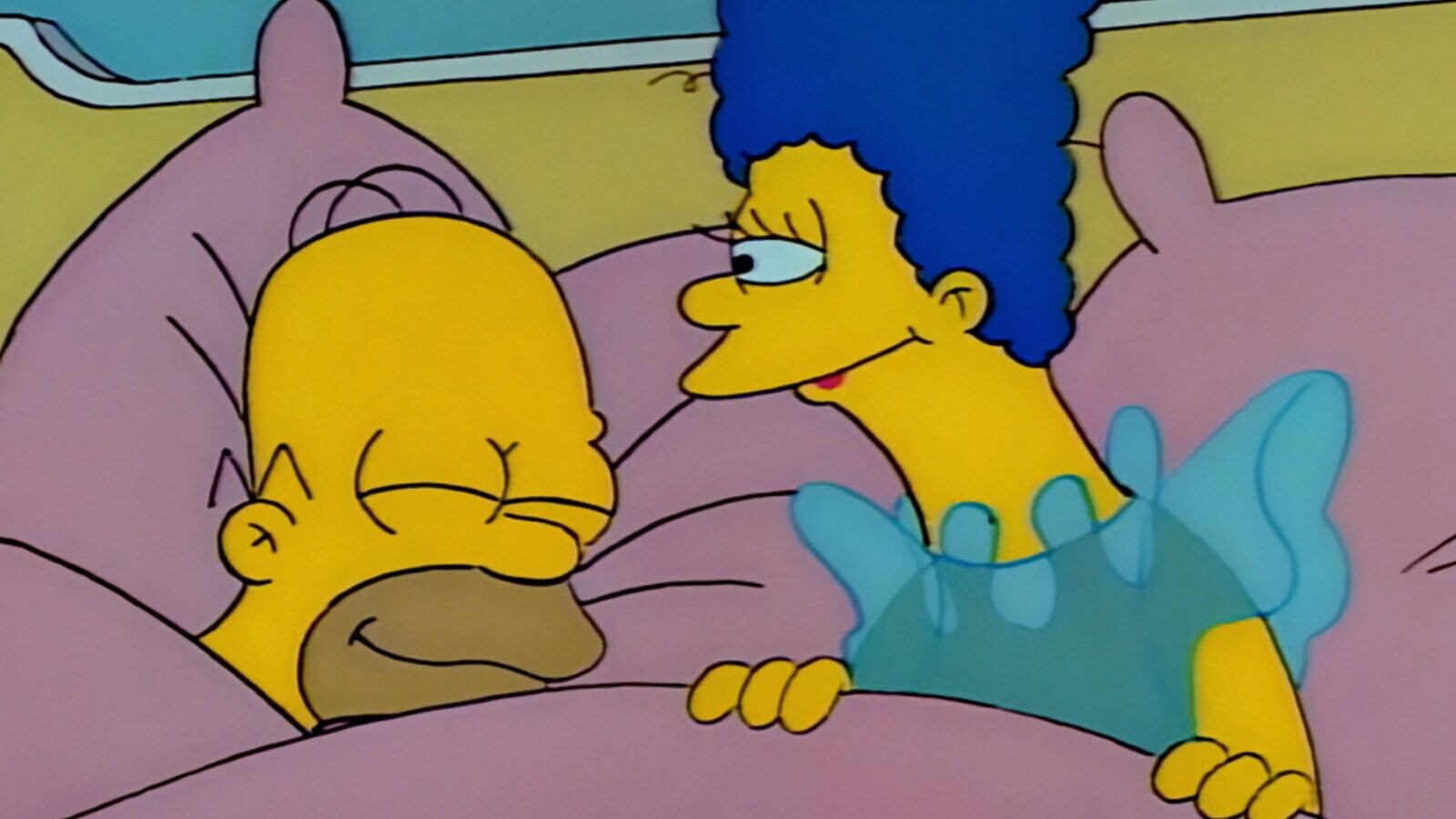 The episode finds Bart and Lisa battling the notorious “Babysitter Bandit” while Homer and Marge spend a romantic evening together, eventually ending up in a swank hotel room where Marge decides to “slip into something more comfortable” prompting Homer’s inquiry about the “blue thing with the things.” So the scene was intended to be sexual in nature, but Homer’s description of Marge’s negligee doesn’t seem too scandalous, even by 1989’s standards.