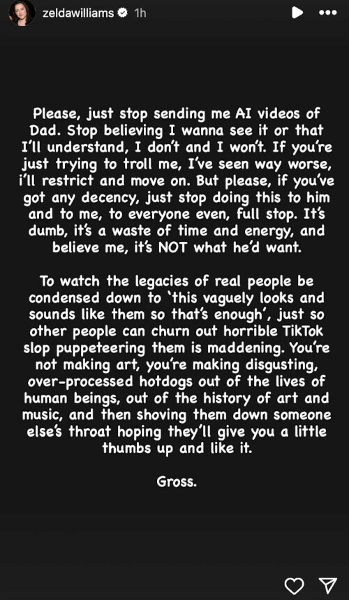 “Please, just stop sending me AI videos of Dad,” Zelda wrote in a recent Instagram Story, per Variety. “Stop believing I wanna see it or that I’ll understand, I don’t and I won’t. If you’re just trying to troll me, I’ve seen way worse, I’ll restrict and move on. But please, if you’ve got any decency, just stop doing this to him and to me, to everyone even, full stop. It’s dumb, it’s a waste of time and energy, and believe me, it’s NOT what he’d want.”