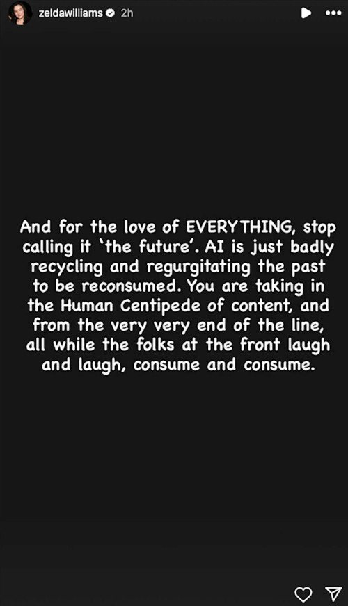 “And for the love of EVERY THING, stop calling it ‘the future,’” she concluded. “AI is just badly recycling and regurgitating the past to be re-consumed. You are taking in the Human Centipede of content, and from the very very end of the line, all while the folks at the front laugh and laugh, consume and consume.”