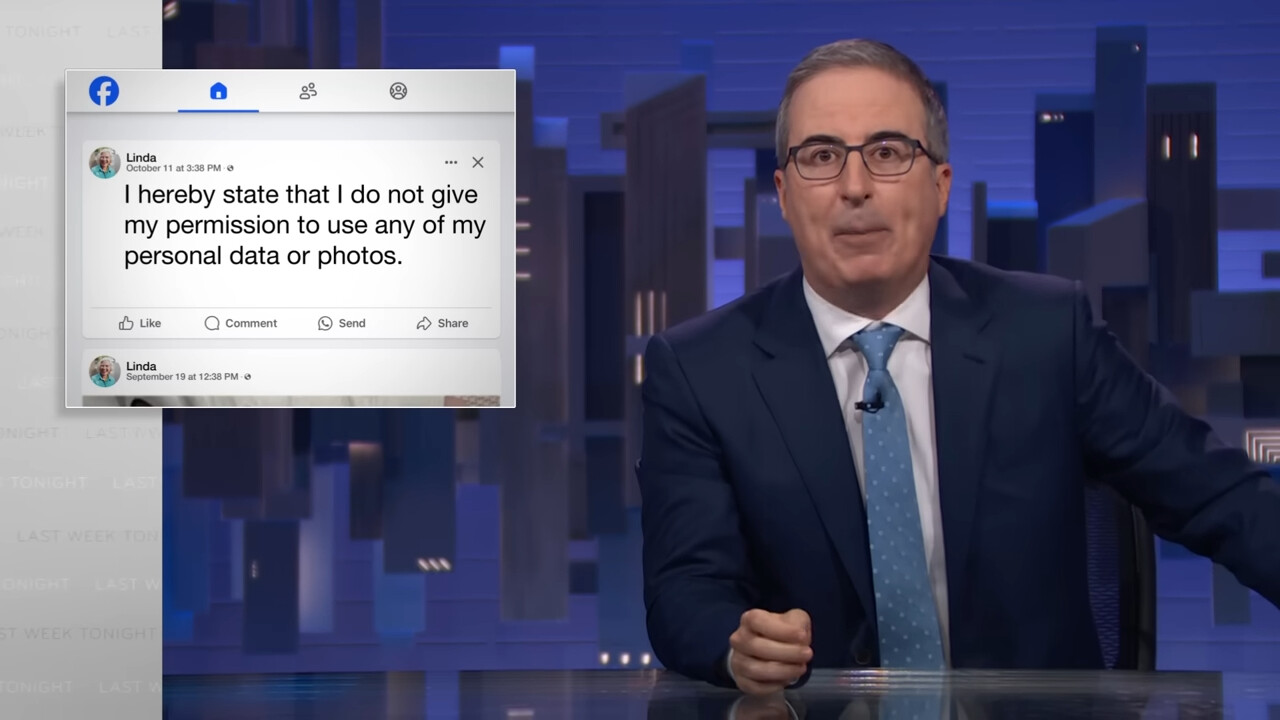“You don’t expect a Times writer to fall for online hoaxes like they’re your 75-year-old aunt on Facebook who keeps posting that message saying, ‘I hereby state that I do not give my permission to use any of my personal data or photos,’” Oliver joked. “That is fake, Linda. Also, why would anybody steal your photos? You exclusively post pictures of your elderly cat, you’re going to be fine.”