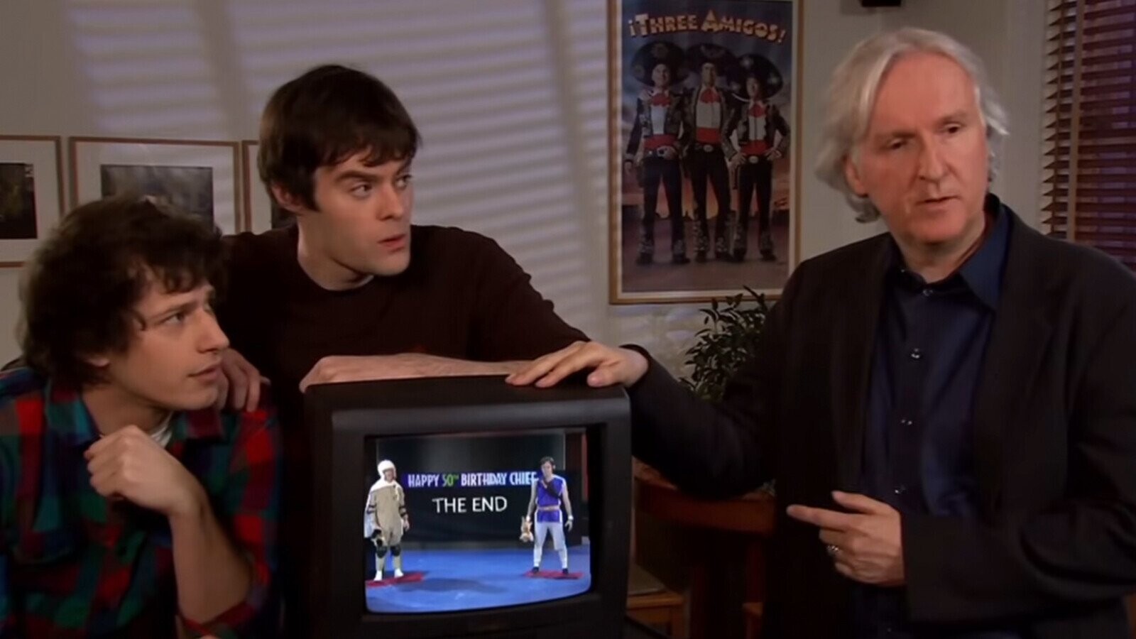 But, as we’ve mentioned before, the True Lies director has had a number of comedic cameos over the years. Perhaps most memorably, back in 2010, Cameron popped up on Saturday Night Live, introducing the fifth installment in the “Laser Cats” series. In the sketch, Cameron pitches Lorne Michaels his new project, which the producer is receptive to, until the filmmaker calls out to Andy Samberg and Bill Hader who wheel in a tiny television.
