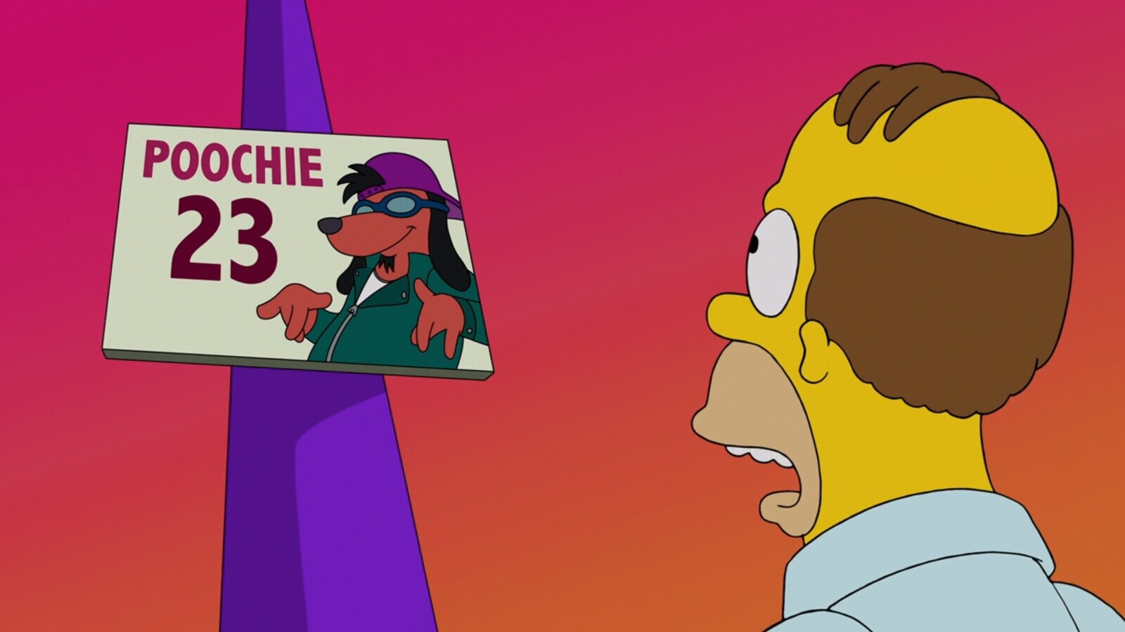 Of course, Poochie was the proactive doggy character that Homer was hired to voice in season 8’s “The Itchy & Scratchy & Poochie Show.” So in this new Simpsons reality, Poochie already existed prior to Bart’s interest in Itchy & Scratchy? Was he still voiced by Homer? And since the character’s likeness was included in the theme park parking lot signage, does that mean that he was actually popular and didn’t die on the way back to his home planet?