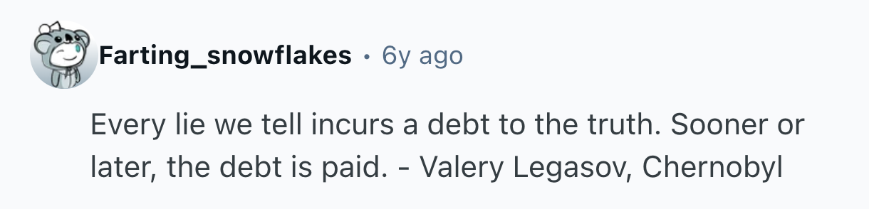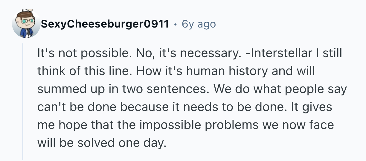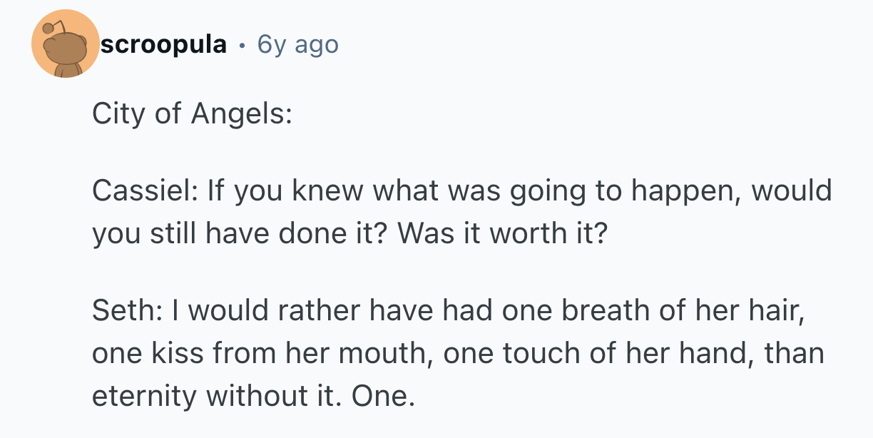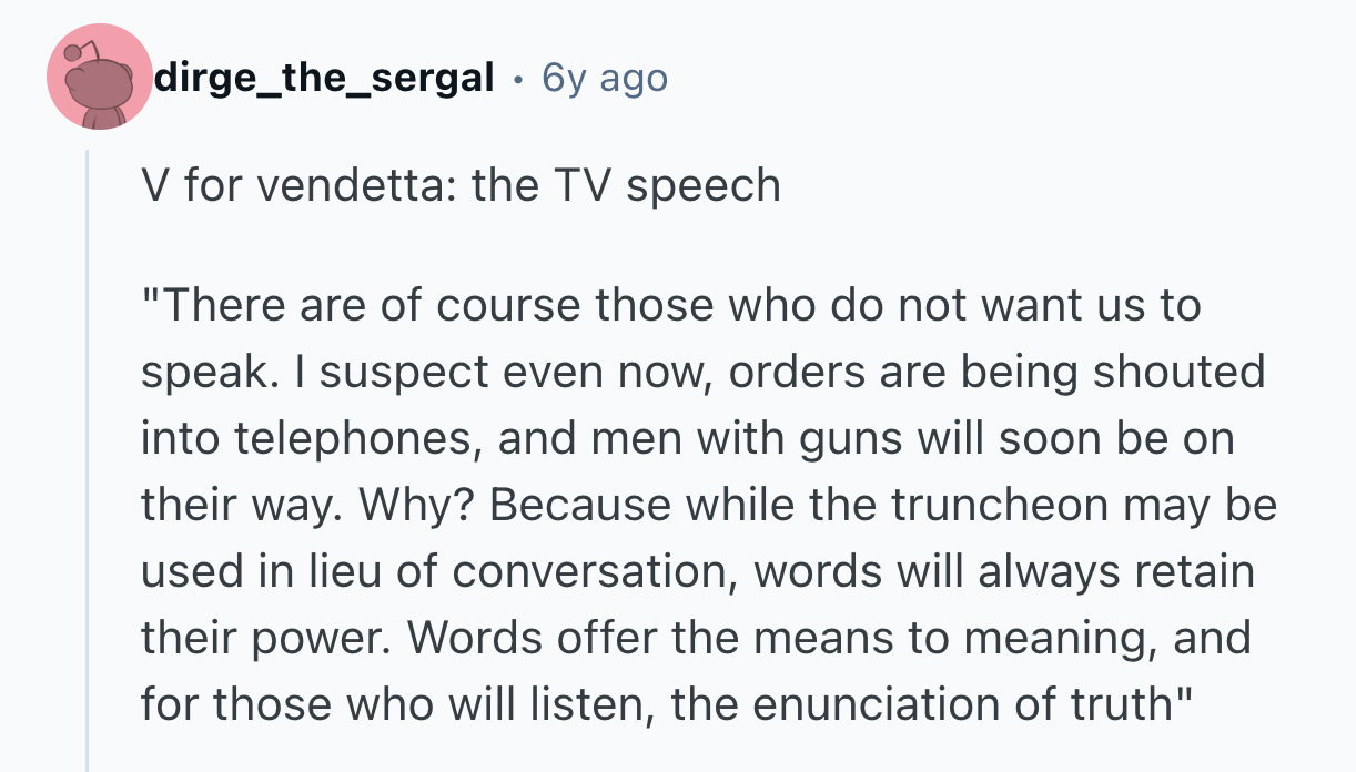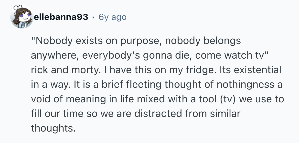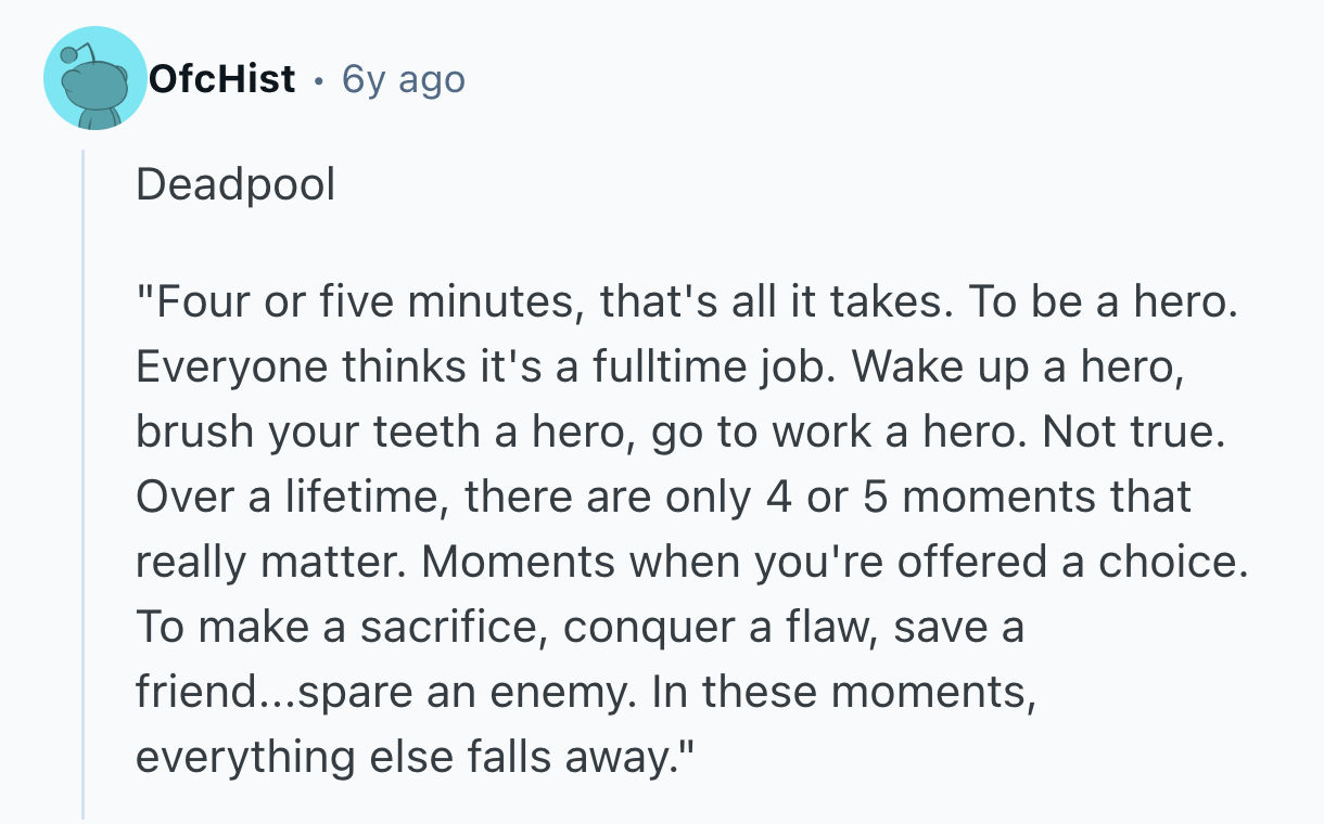 But that's not always the case. Some of our favorite movies and TV shows have stuck with us precisely because of a well-timed sentiment of powerful, unvarnished truth. Sometimes, a line that turns your whole life around can even arise where you least expect it. That's why u/cheerioaddict asked r/AskReddit, “What piece of dialogue was so thought provoking and raw, you had to pause and take a moment to appreciate it?”