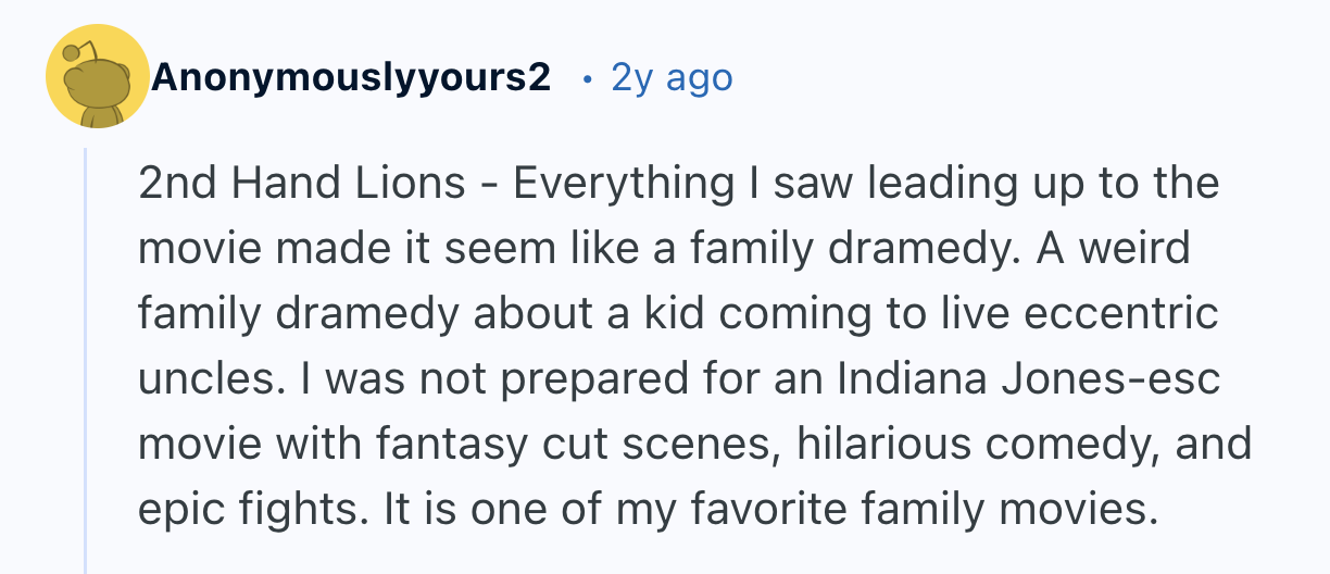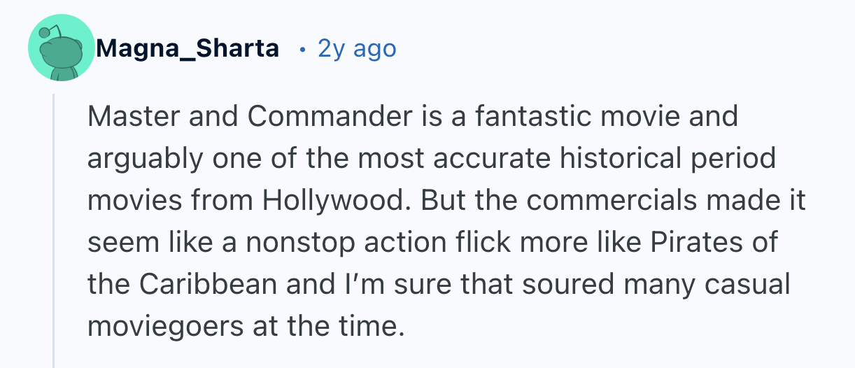 “The first that comes to mind for me is John Carter,” u/supesforlike told r/movies. “While not particularly worthy of critical acclaim IMO, it was an incredibly fun movie with fantastic effects that I feel could have set up a successful series. This movie failed to find success not only due to its rather dull title but also because the marketing for it was nonexistent. My dad took me to see it because he had read the comics as a kid and was excited for it, but otherwise, I doubt I ever would have heard of it.”