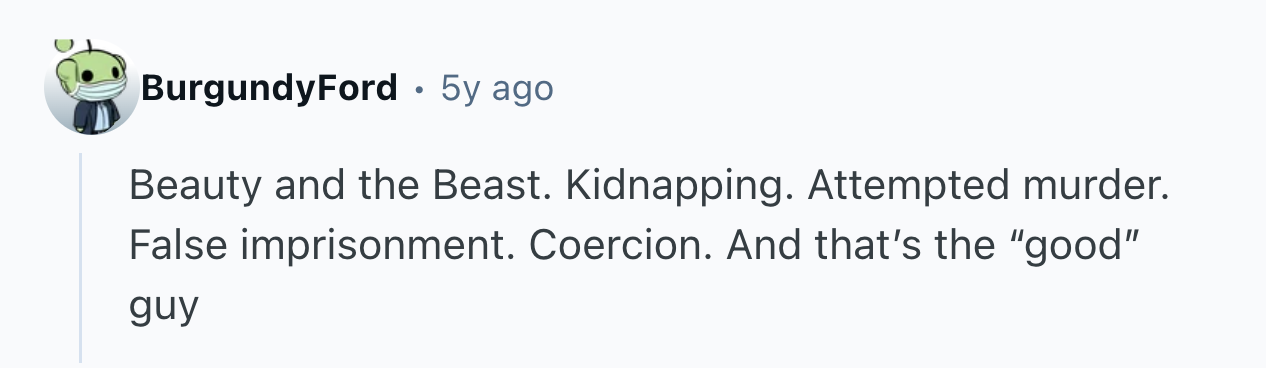 But that's not even the worst part. The girl was fleeing her stepmother, who was trying to murder her and succeeded until some rando came along and sexually assaulted her, obliging her to let him carry her away from her new friends. That's not just not normal, it's several felonies and at least one psychological phenomenon.