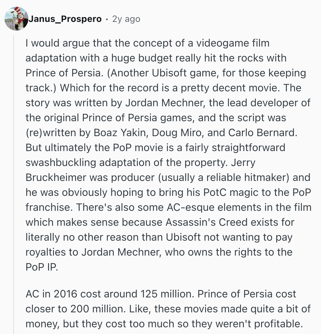 “The games were already basically blockbuster movies, and the format would have allowed for countless installments (given that almost every game had a different location and protagonist). The franchise could have easily been The Matrix meets Pirates of the Caribbean and made shitloads of money. They even managed to get Michael Fassbender, one of the best actors alive, as the lead.”