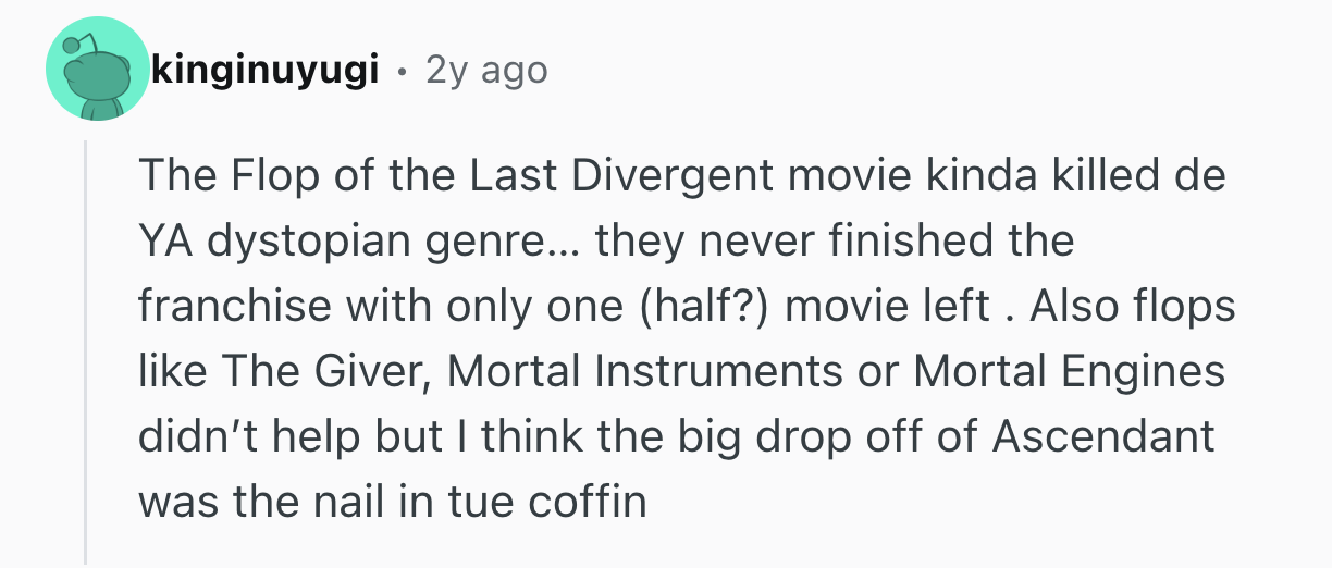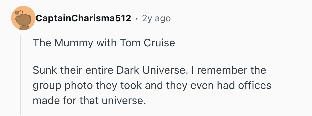 Some movies don't just flop. They cannonball so hard that they blow any further attempts at a career, an audience, or even an entire genre straight out of the water. For example, “I've theorized that the failure of the Assassin's Creed movie killed the chances of big-budget, big-screen adaptations of video game movies aimed towards adults becoming mainstream,” u/MasterLawlzReborn told r/boxoffice.