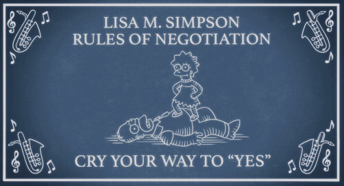 But the bit isn’t over yet. When Lisa announces that she wants to see Kneesock Dolls (“My favorite girl pop band, from my favorite Korea”) we get to see the first of the “Homer J. Simpson Rules of Negotiation” which is “Say Anything to Do Nothing.” After rattling off a bunch of nonsense to weasel out of buying tickets, Lisa bursts into tears and he relents.