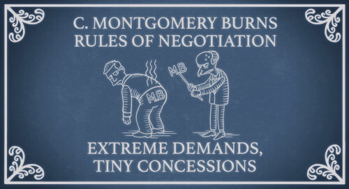 Then there’s “Extreme Demands, Tiny Concessions,” which finds Burns opening the blinds in the darkened meeting room very slightly and telling his guests “If you agree to triple your offer, I will, in return, let in a sliver of sunlight.” They eventually storm off, which Mr. Burns refers to as a “classic counter move.”