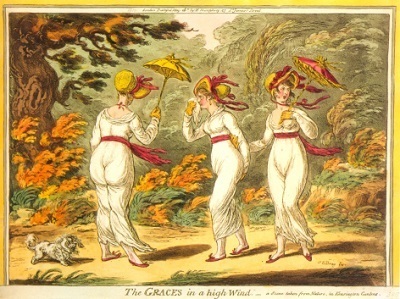 Women, on the other hand, went from drowning in fabric to wearing light dresses that would have been lingerie only a few years before. But at some point somebody thought that, while walking around in one's underwear was all well and good, they still weren't really naked enough. During the late 1700s and early 1800s, the cloth women used to make their dresses became sheerer and sheerer to the point that they were actually see-through. On top of that, many ladies stopped wearing undergarments or wore a pink body suit to emphasis their nakedity. The coolest, most fashionable women in Paris, called the Merveilleuse, were mocked by caricaturists for basically going out in public half-naked, and the women in England followed their lead.