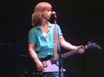 ... and guitarist J.Y. Young, bedecked in shoulder pads and feathered hair, looks like he's ready to perform in a Dynasty-themed drag show. All the while, bassist Chuck Panozzo looks on from the comfort of a full-on goddamn tuxedo.