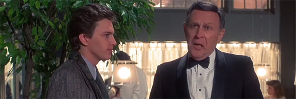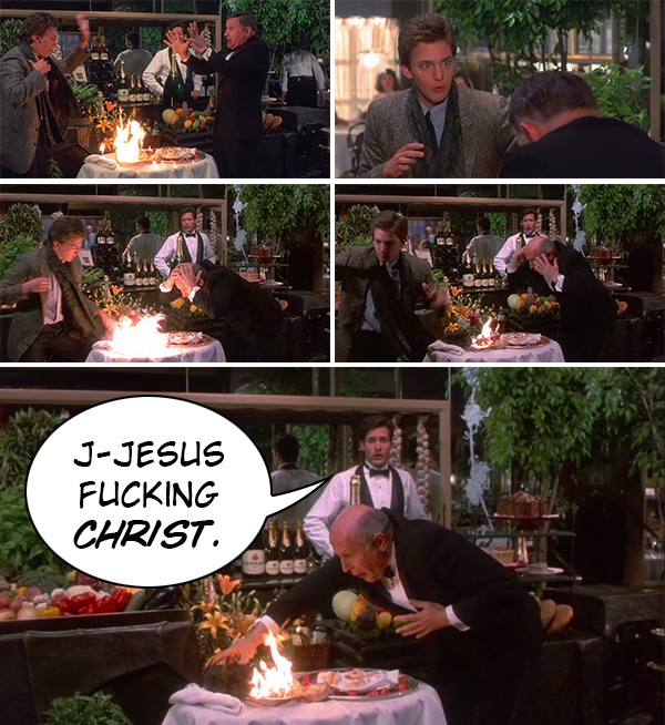He grabs the toupee off Hans' head to use it to fight the fire, completely ineffectively. It does nothing. Because why would it!? There's a reason fire hoses don't squirt flopping wads of artificial human hair. And then, with the fire now burning a plate of oysters Rockefeller and a small wig, he just leaves! Andrew McCarthy lets the man fish his own fake hair out of the flames while his co-workers and customers witness his humiliation, each of them forming a mental list of all the friends they need to tell. This is a sociopath's idea of comedy. Some mannequin-fucker stormed into this man's life and went, "Fuck your job! Fuck your hair! Fuck this fire! And fuck this place! Andy McCarthy out!"