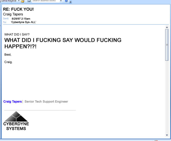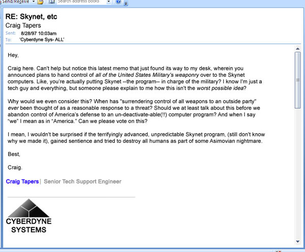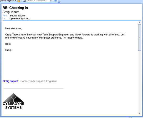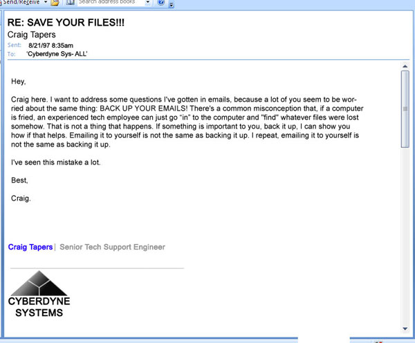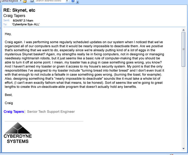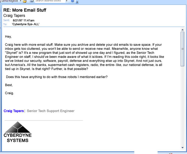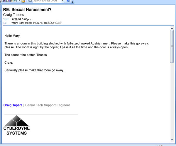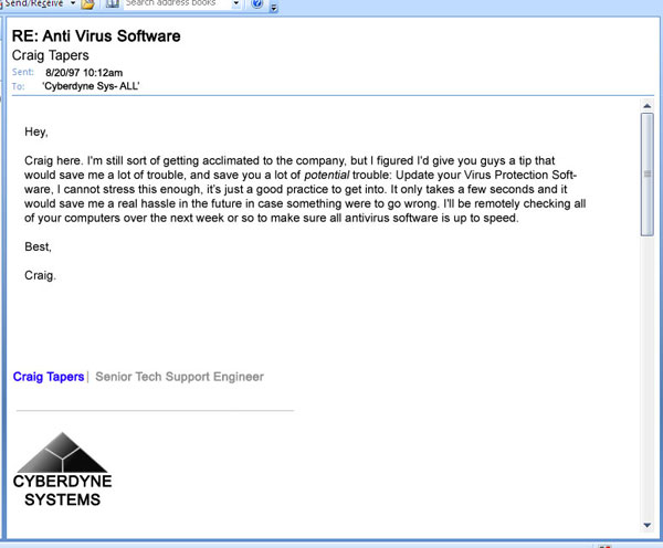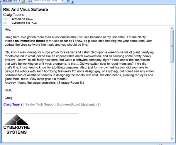 Hey all, Just a reminder to please update the virus software like I said. Also, there is a room in this building full of naked Austrian cyborgs. Anyone know what\'s going on there?