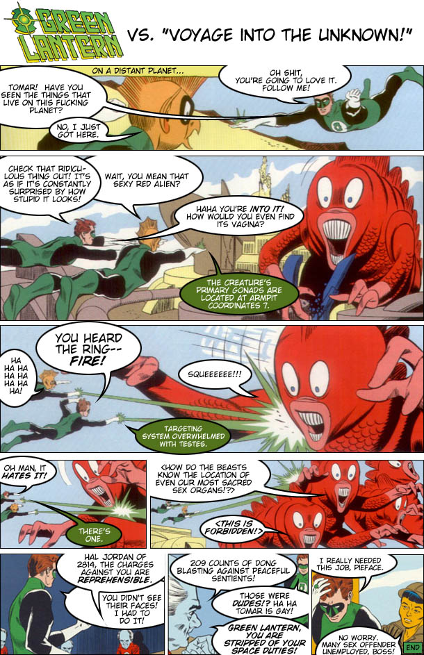 Green Lantern has a magic space ring that can do anything, and it's his job to patrol an inconceivably giant section of the universe. So imagine you were a man, with a man's needs, all by yourself in space, with a ring that can do anything. Your imagination just conjured Man Comics Presents: Green Lantern: Star Pervert. Great job.